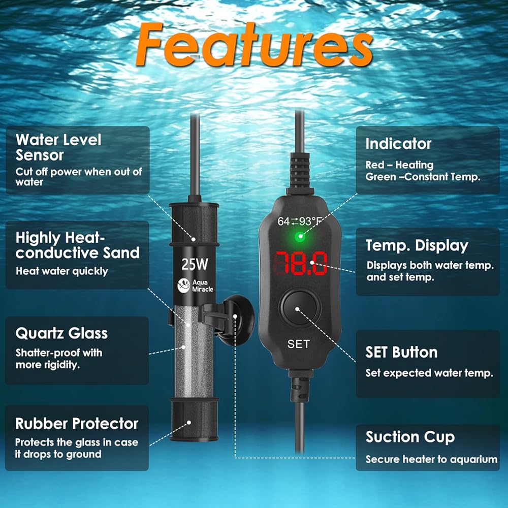 ADVANCED TEMPERATURE MANAGEMENT - Thanks to progressive inverter engineering and embedded chips, our fish heater offers accurate temperature control within a remarkable 1F precision. This outperforms traditional knob-adjusted heaters. The intuitive thermostat presents real-time and targeted temperatures, making the heater's operation a cinch.