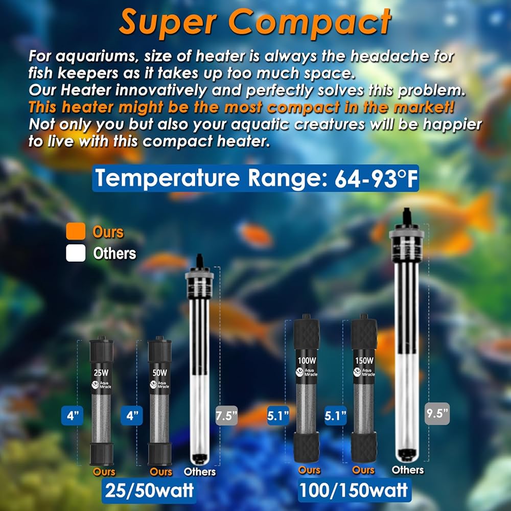COMPACT DESIGN - This aquarium heater boasts an exceptionally compact size, likely the smallest available. It's approximately half the length of standard fish heaters, offering a revolutionary solution to the persistent issue of bulky heaters that aquarists often face. Despite its diminutive size, it delivers robust heating capabilities, providing a temperature range of 64F to 93F.