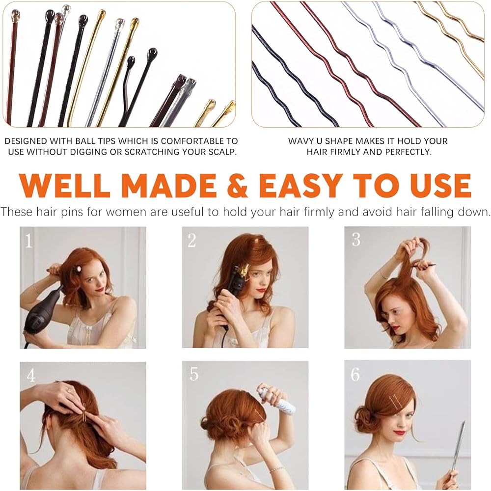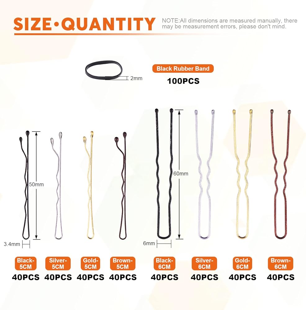 ✦✧ Our kit comes with 160 bobby pins, 160 U shaped hair pins, 100 rubber bands. Total 420pcs. Come in 4 classic color, elegant and practical to makes your hair styling easy to complete.