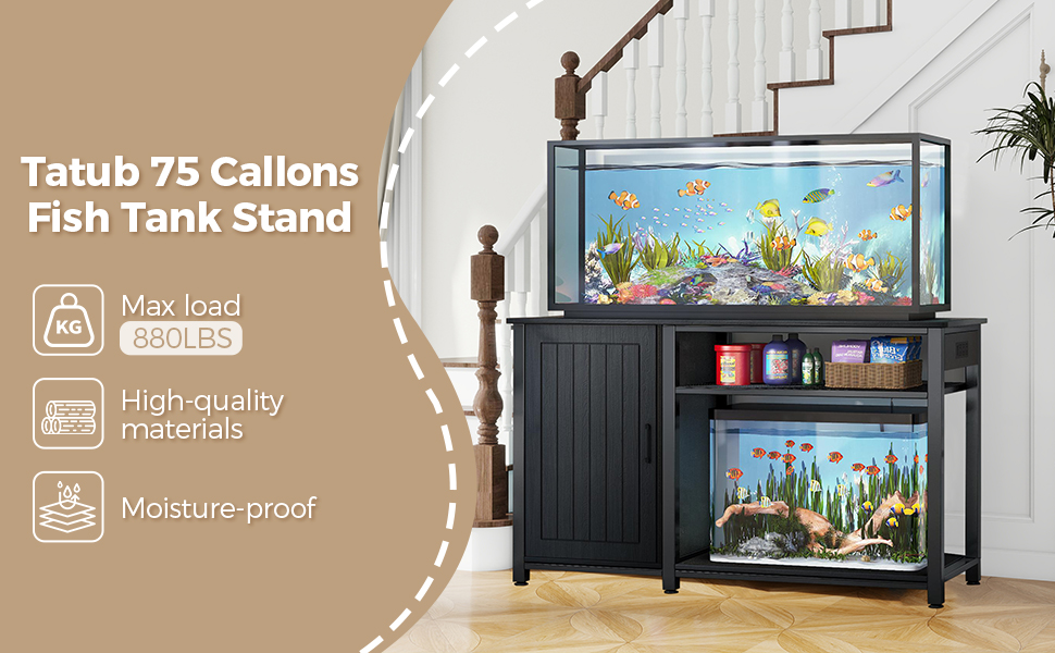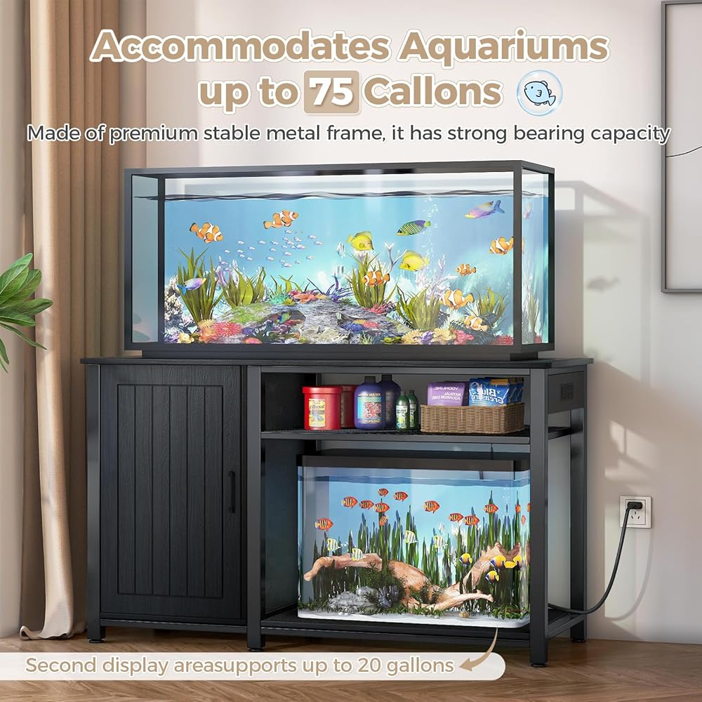 【Versatile Design】This 55-gallon fish tank stand effectively combines display and storage, and can accommodate a second 20-gallon aquarium at the bottom, perfect for maximizing space in homes with multiple aquariums or reptiles