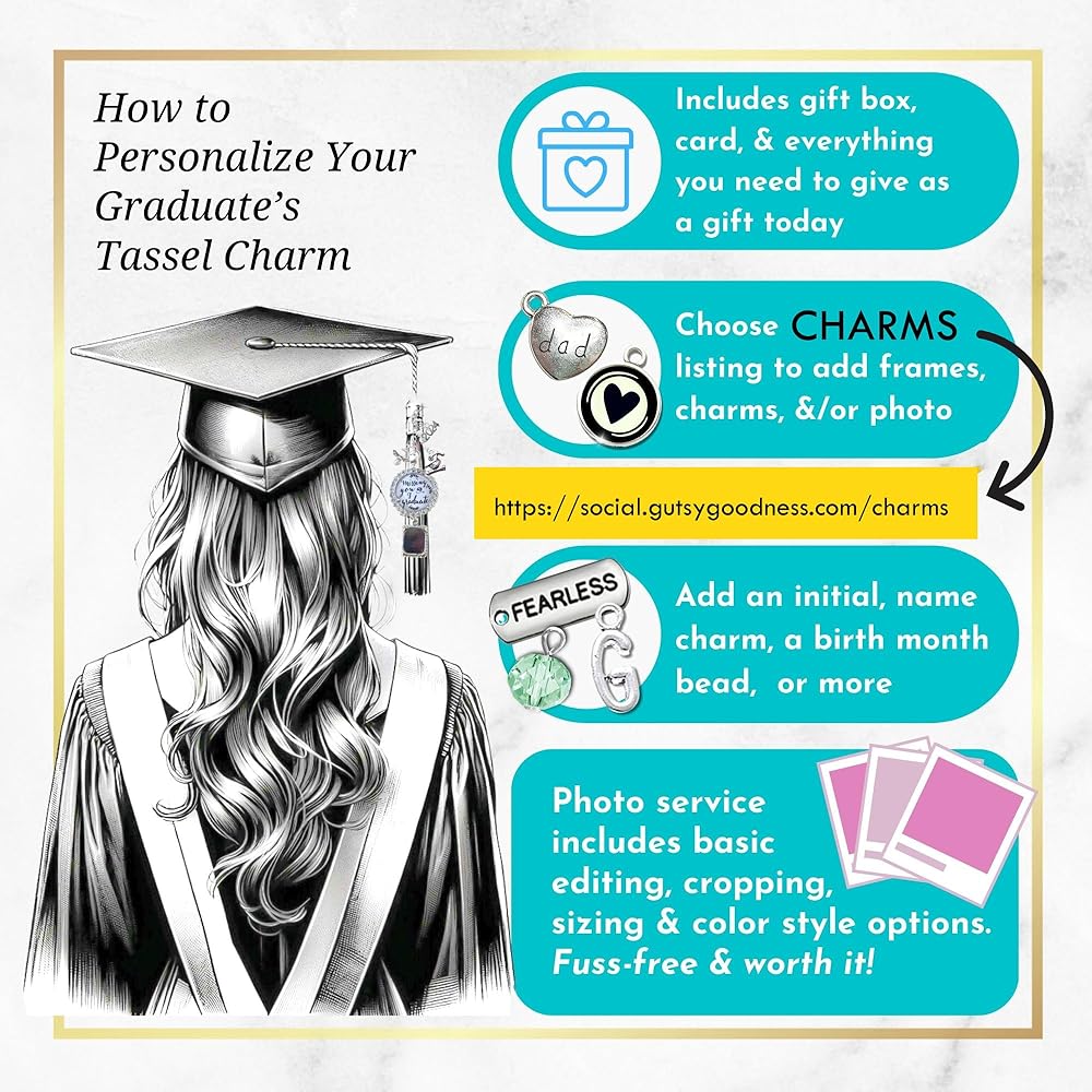 HANDCRAFTED WITH CARE: Each Graduation Cap Tassel Memorial Photo Charm is meticulously assembled by skilled artisans. From the sparkling rhinestone pendant to the eloquent message card, our creations are handcrafted with attention to detail. The tassel jewelry features silver charms, elegantly complemented by a glass quote pendant.