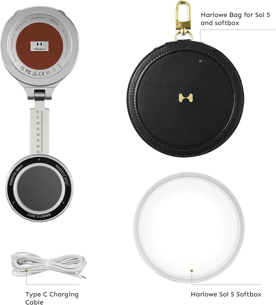 In The Box: 1 Harlowe Sol 5 Bi-Color Light for Mobile with Magnetic Mount; 1 Harlowe Sol 5 Softbox; 1 Harlowe Bag for Sol 5 and softbox