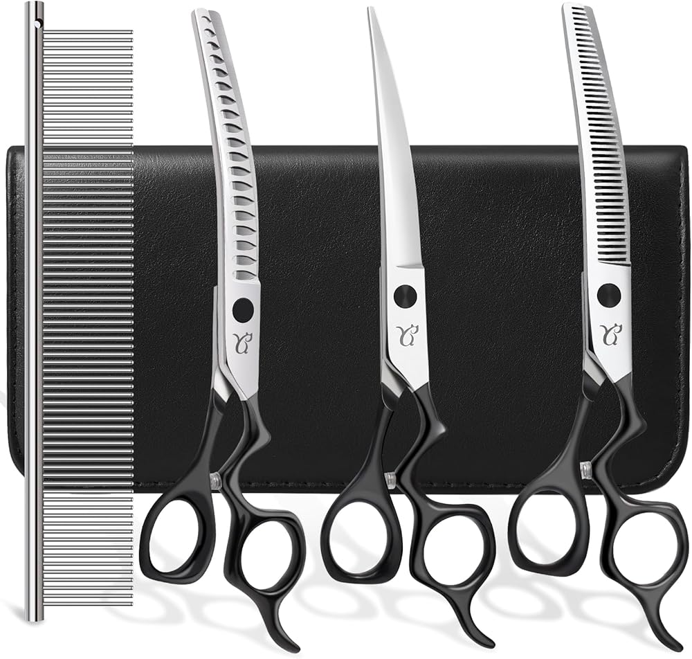 【Professional Dog Grooming Kit】The kit includes 1×curved dog scissors,1×curved fishbone scissors,1×curved thinning scissors,1×19cm pet comb,1×cleaning cloth,1×regulator,1×black storage bag.