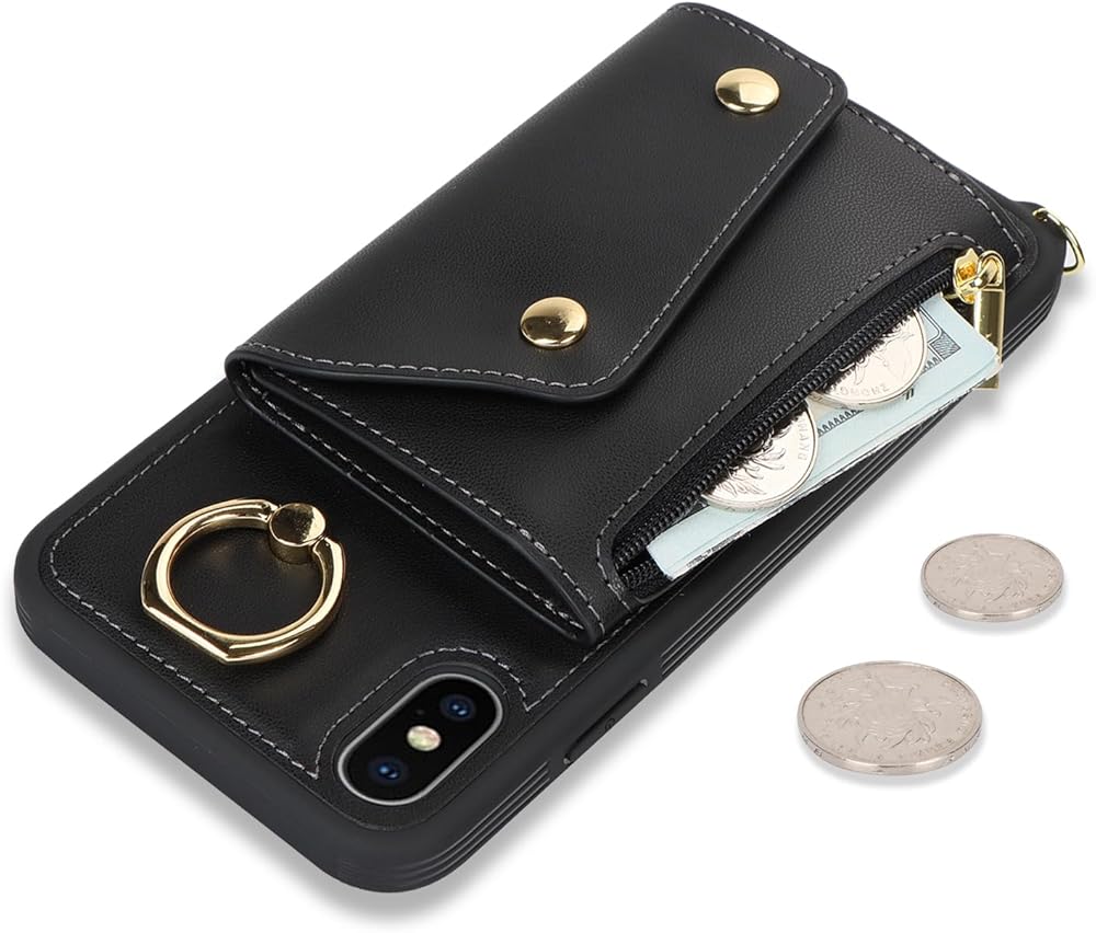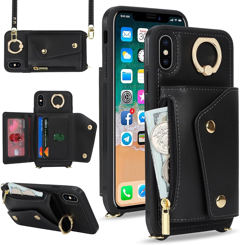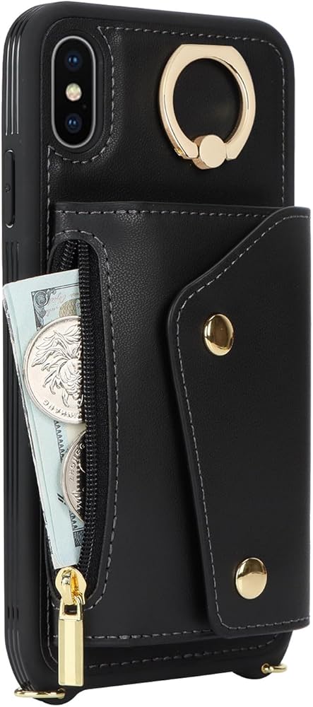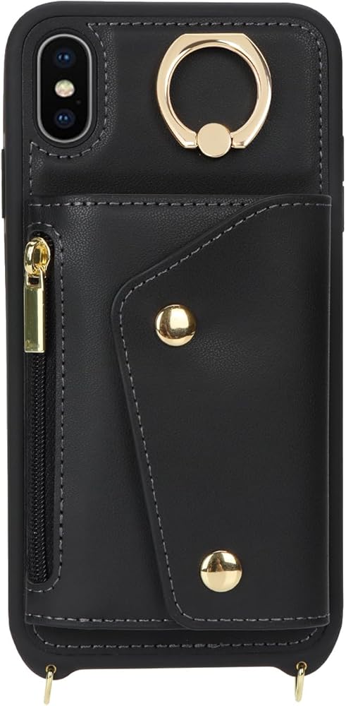 for iPhone X/XS Case with Card Holder and Strap - Zipper Pocket,Crossbody Lanyard Strap,Credit Card Holder,Stand Ring,Cute Phone Wallet Case for Women(Black,5.8 Inch)