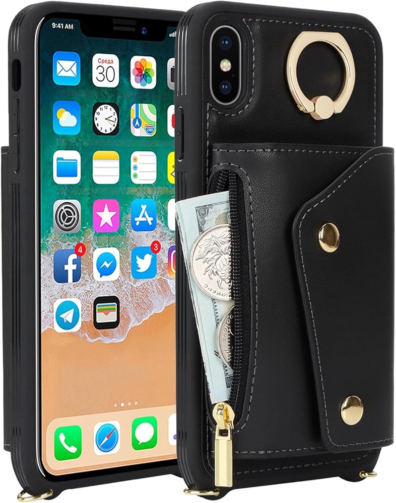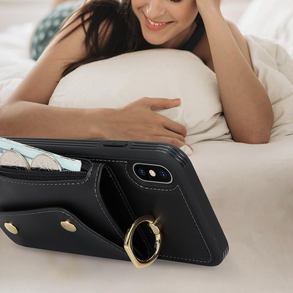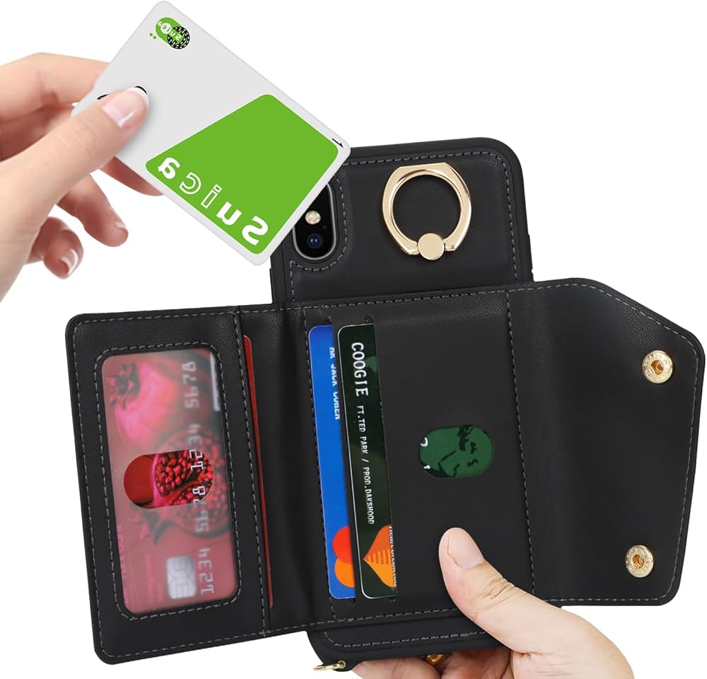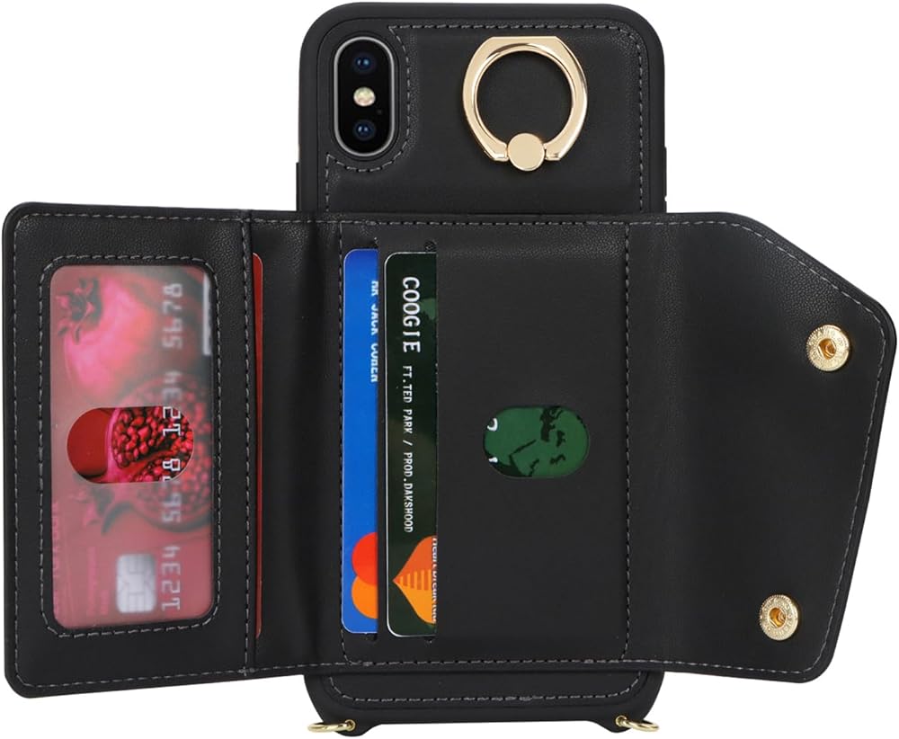 for iPhone X/XS Case with Card Holder and Strap - Zipper Pocket,Crossbody Lanyard Strap,Credit Card Holder,Stand Ring,Cute Phone Wallet Case for Women(Black,5.8 Inch)