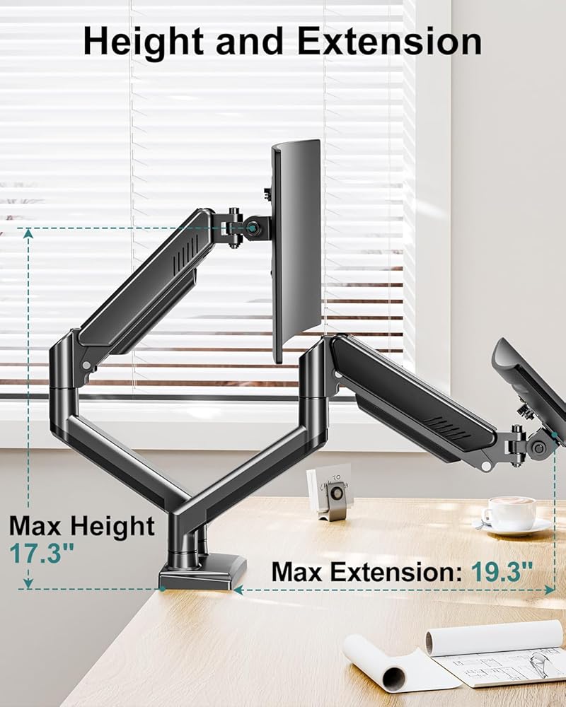 Comfortable for Working - The dual computer monitor stand is designed with ergonomic, max height is up to 17.3" and max extension reaches 18.5", helping you easily adjust monitors to eye level. Your screen can be adjusted up and down with one hand to accommodate your sitting position, improving your work experience