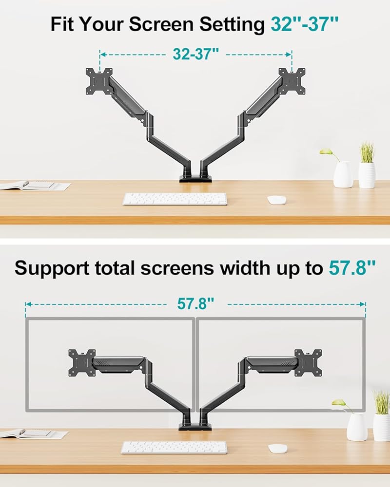 Clear Up Desk Space - The hidden cable management can keep your desktop cleaner and tidier. And the double monitor arm can lift 2 screens off the desk to free up more than 80% desktop space, so that you can place more accessories to create a more comfortable work environment