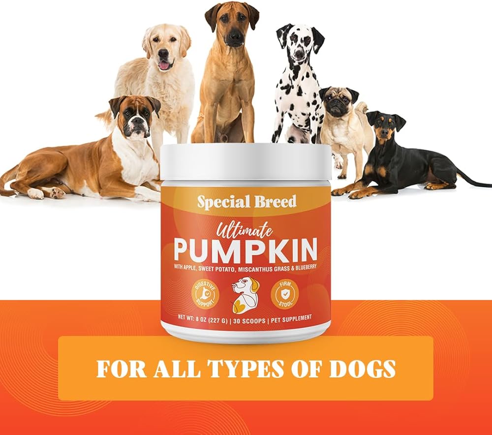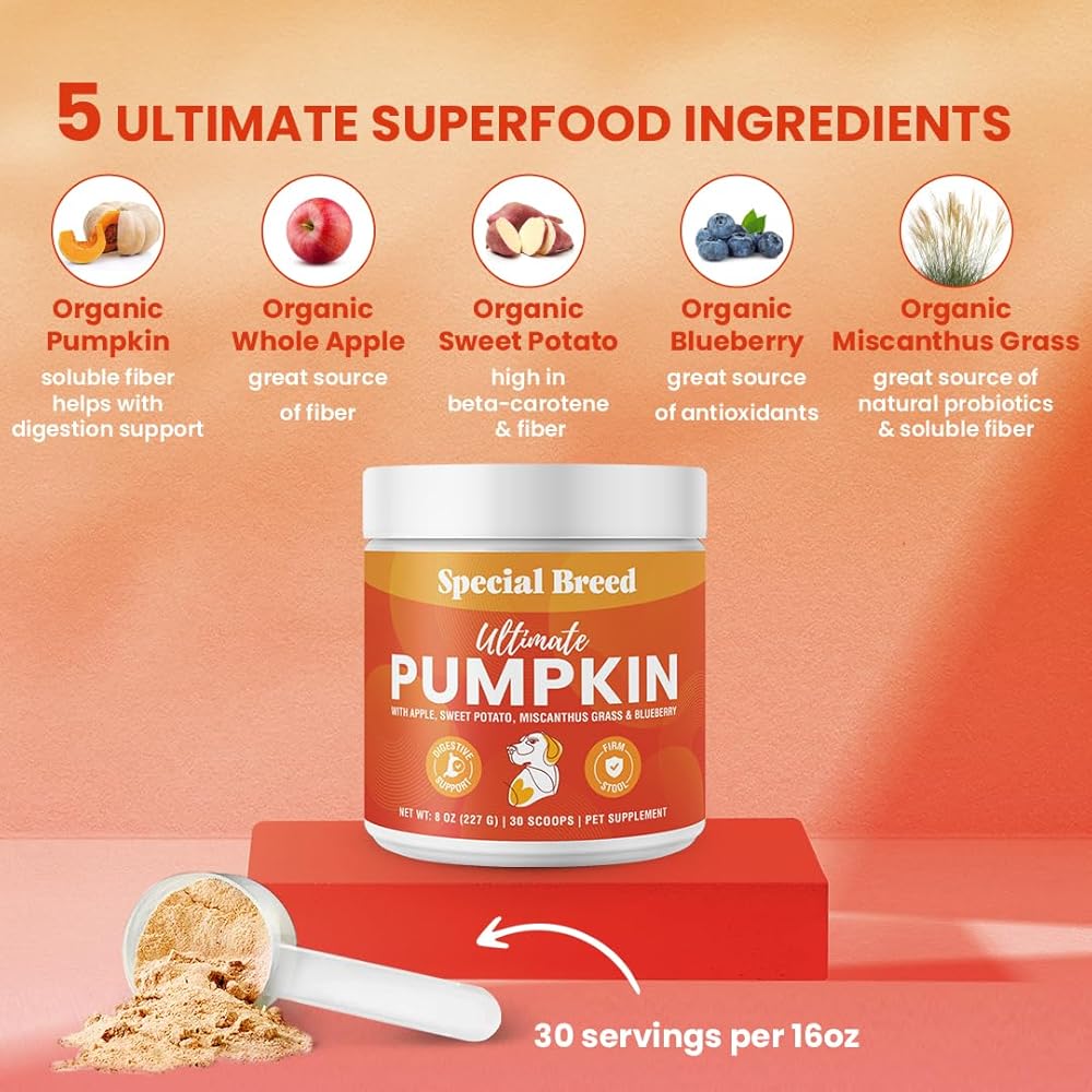 Special Breed Ultimate Pumpkin for Dogs with Organic Pumpkin, Apple, Sweet Potato, Miscanthus Grass, and Blueberry is a top-tier, natural pet food supplement designed to enhance your dog's digestive health. Made in the USA, this high-quality blend offers a perfect combination of organic ingredients to provide optimal fiber and nutrition. Each 16 oz container delivers 60 scoops of non-GMO, gluten-free support. This unique supplement promotes firm stool and provides effective constipation relief, ensuring your dog maintains a healthy digestive system. The carefully selected ingredients are processed to preserve their natural benefits, giving your pet the best possible care. Perfect for dogs of all ages and sizes, Special Breed Ultimate Organic Pumpkin offers a convenient and natural way to support your dog's digestive health. Trust in Special Breed for quality and effectiveness in every scoop, enhancing your dog's well-being with every serving.