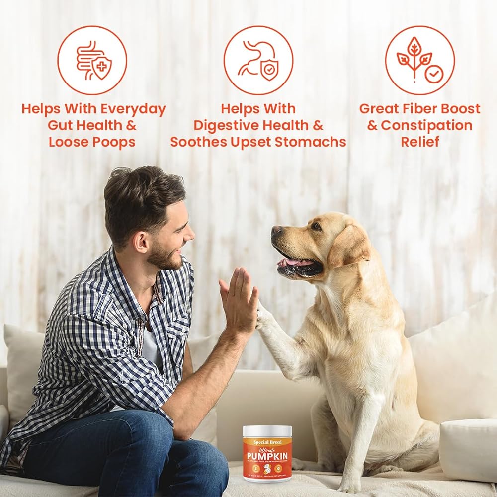 Natural Digestive Support: Our 5-In-1 organic pumpkin powder complex helps with every day gut health. Rich in fiber, this supplement helps with digestive issues, constipation, diarrhea, upset stomach, and helps make poops firm and dogs regular.