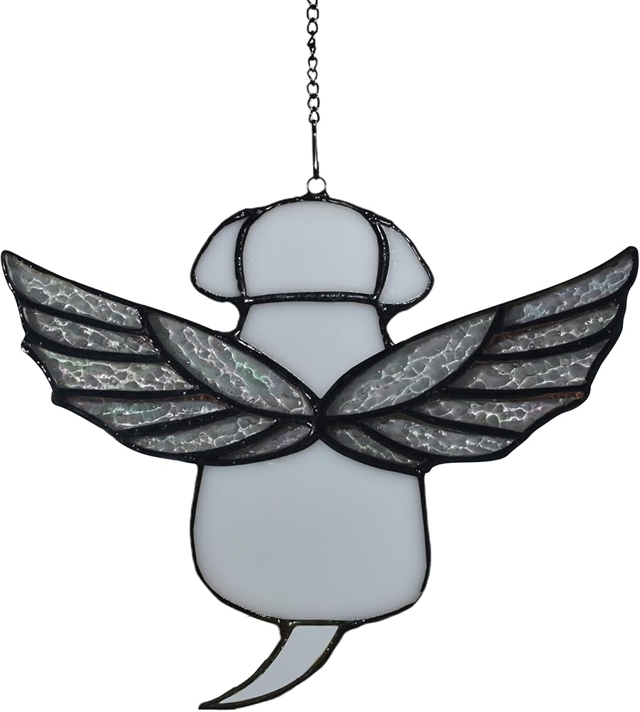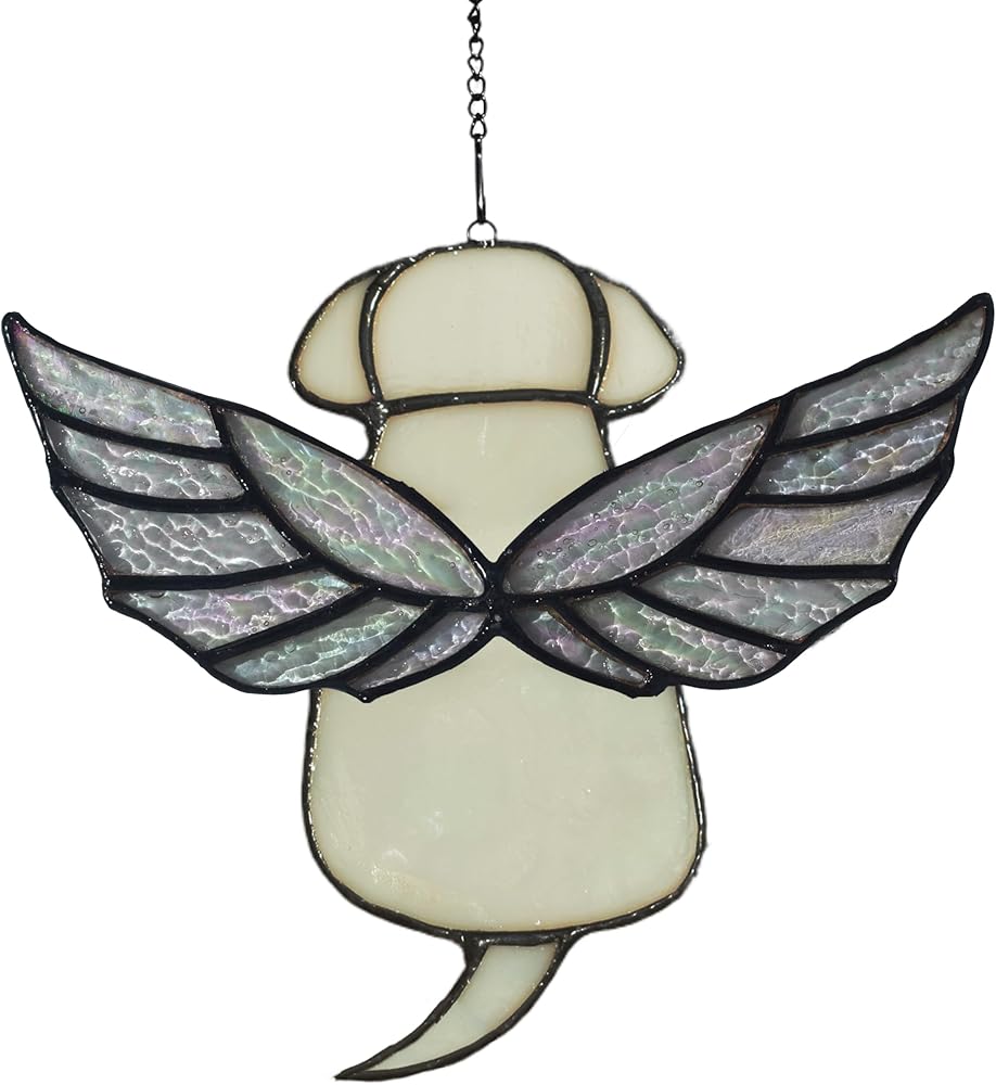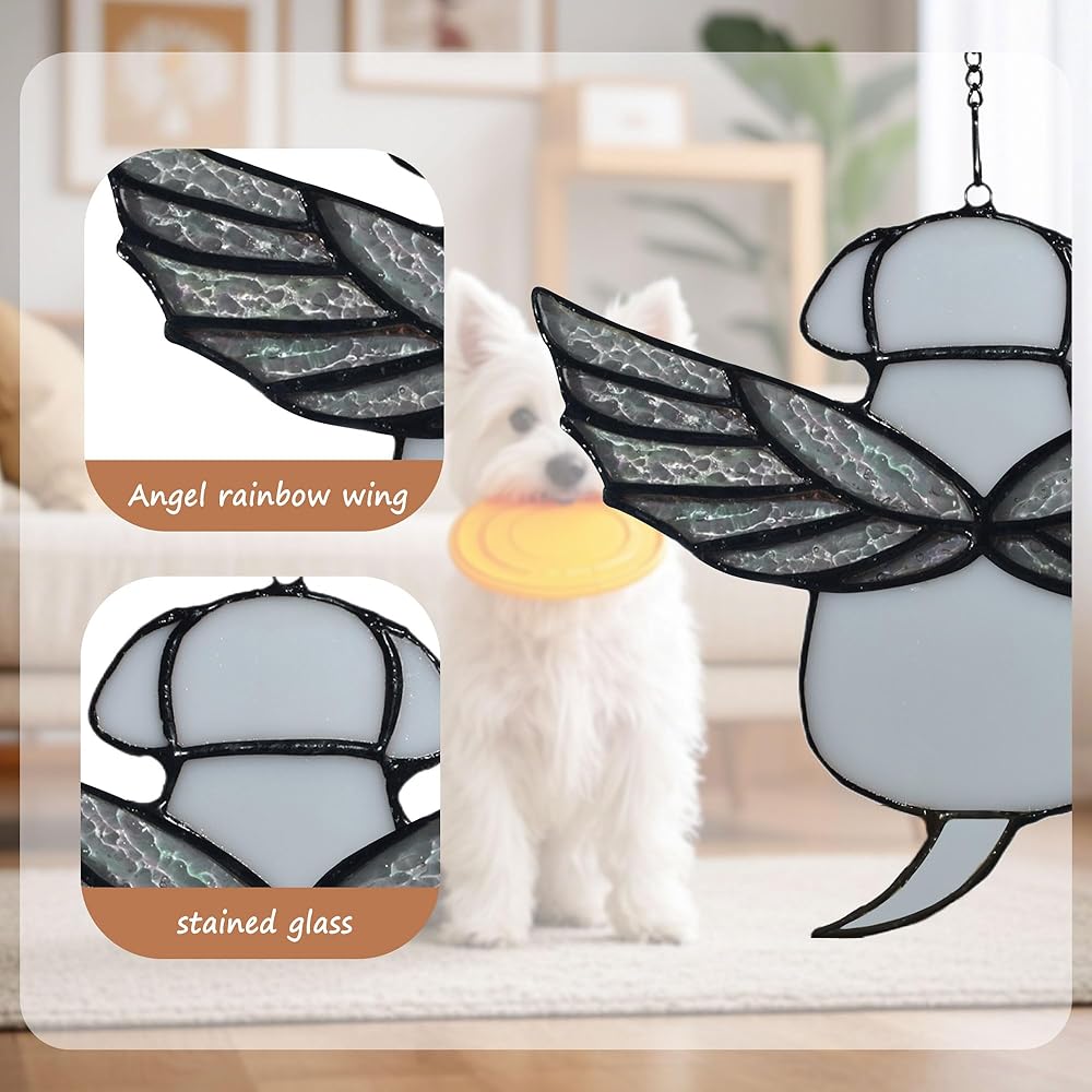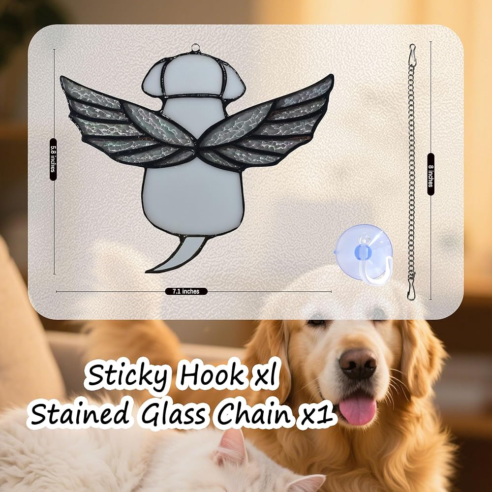 Angel dog stained glass for window hangings: the angel rainbow wing made of transformation brightness and allure when it ill uminate by natural light.it will warmed loss of dog people heart.