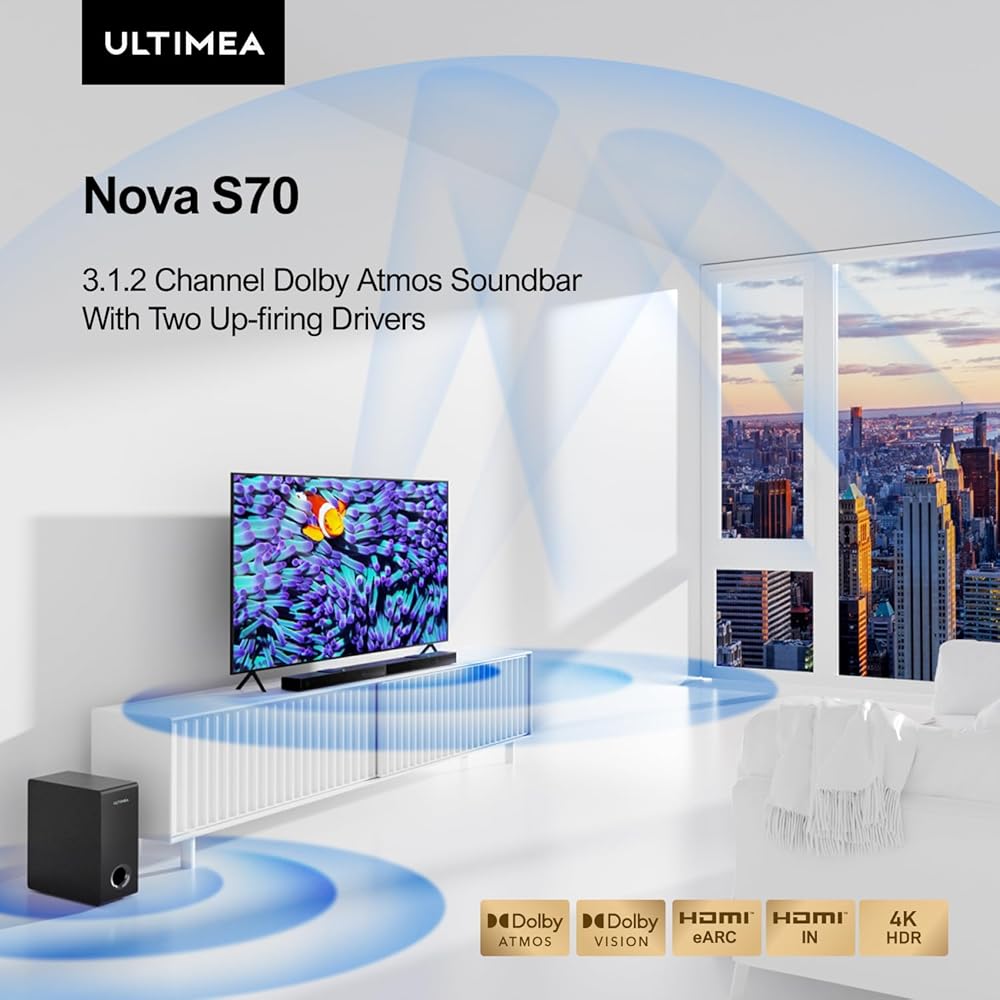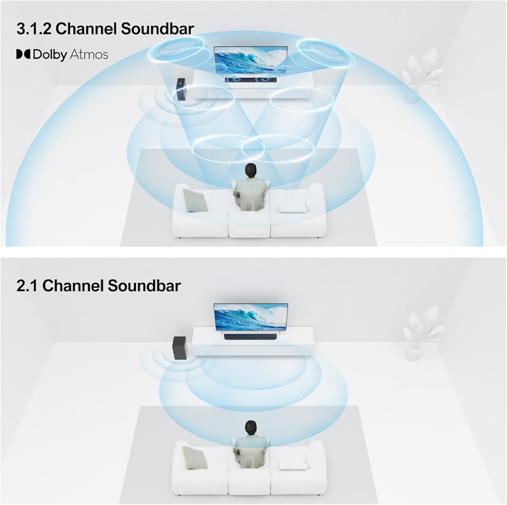 3.1.2 Channel Dolby Atmos Soundbar: Elevate your home theater experience with three-dimensional sound, placing you at the heart of the audio. The three main channels provide a wider, clearer soundstage, while two upward-firing drivers ensure precise dynamic positioning for immersive soundscapes.
