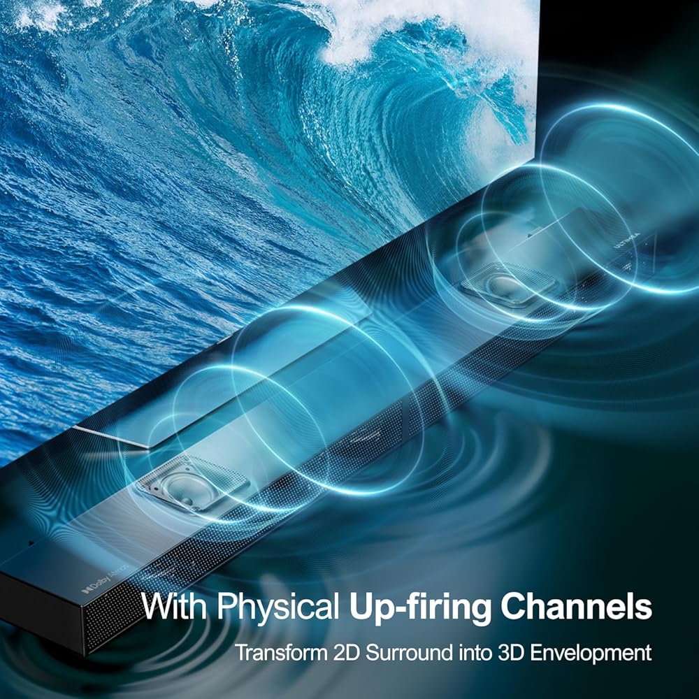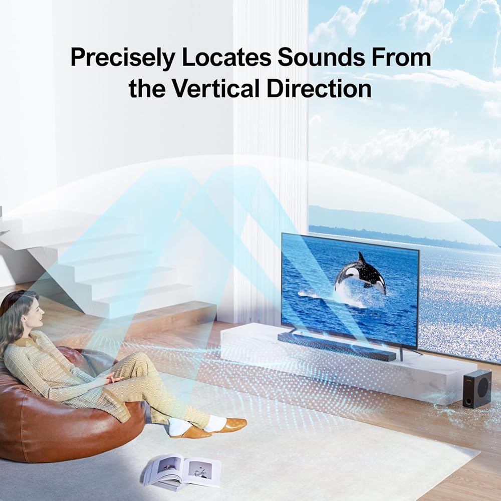 2 Upward-firing Drivers for Immersive Audio: Experience rich, cinematic sound as the upward-firing drivers reflect soundwaves off the ceiling, creating a truly immersive surround sound field. Combined with Dolby Atmos, this TV soundbar brings vertical audio to life—perfect for realistic effects like raindrops, wind, or flying objects.
