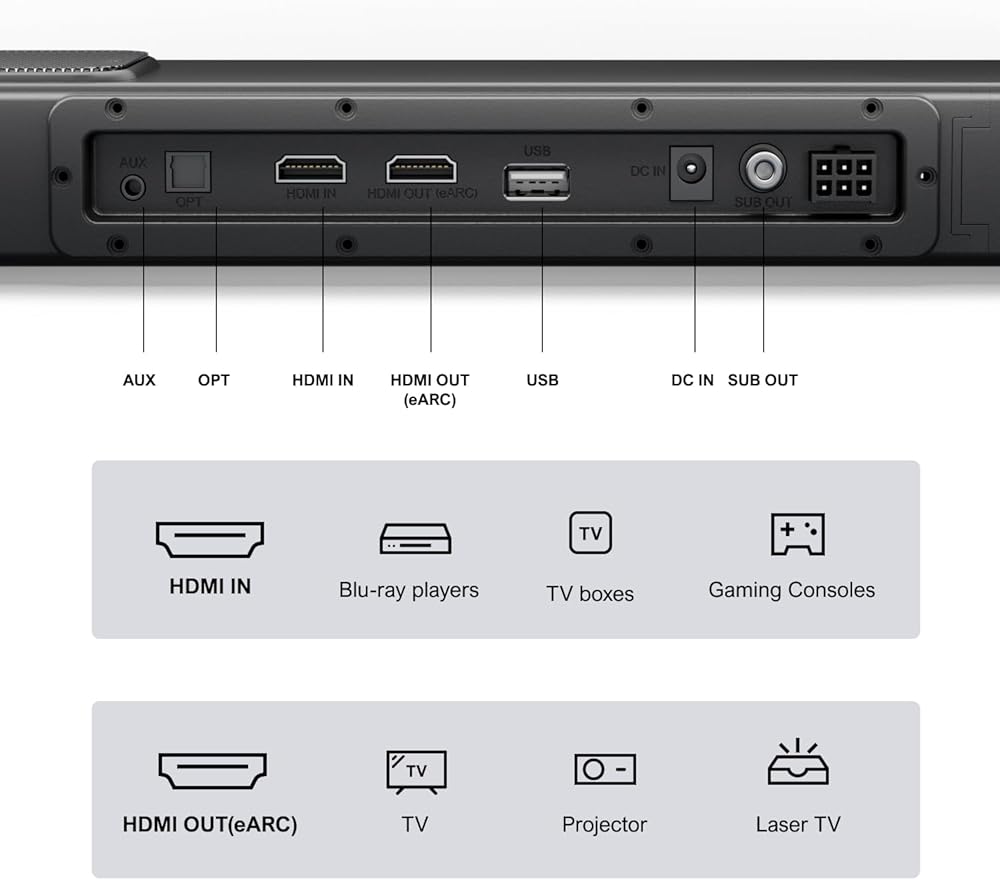 Simplified Entertainment with HDMI IN: Connect your Blu-ray player, gaming console, or TV box using a single HDMI cable. The HDMI IN port on the soundbar minimizes cable clutter, simplifying your home theater system and creating a seamless entertainment experience.