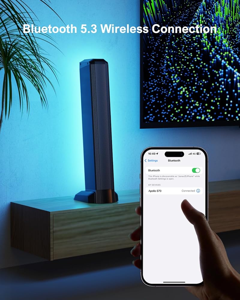 Home Decor Enhancement: The Apollo S70 sound bar not only delivers exceptional sound quality but also functions as a 2-in-1 entertainment hub, blending high-quality audio with dynamic RGB lighting. This tv soundbar enhances your listening experience while adding vibrant colors to your space, elevating both the atmosphere and aesthetic of your home. Please note: The soundbar's backlights cannot sync with the TV screen's colors and rhythm.