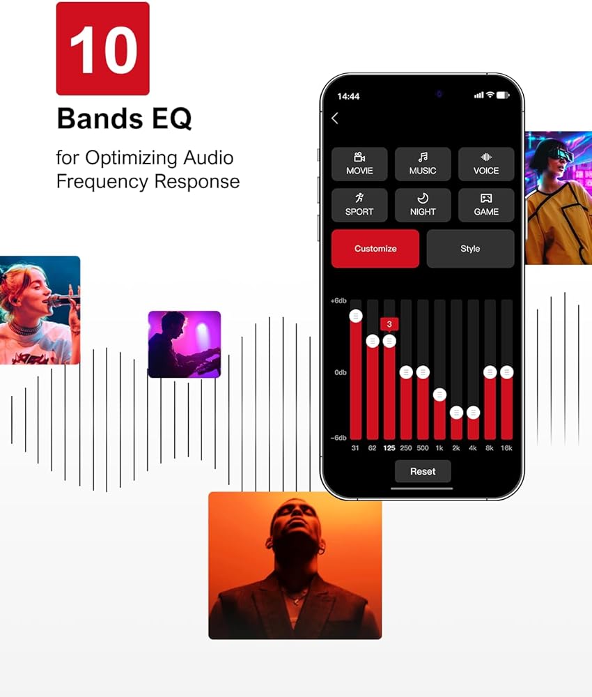 10-Band Equalizer Settings: Elevate your audio experience with 6 tailored EQ modes: Movie, Music, Voice, Sport, Game, and Night, each finely tuned for optimal performance. Further refine your listening with the Ultimea App's advanced "Customize", allowing you to dial in the perfect personalized sound to match your preferences and environment.