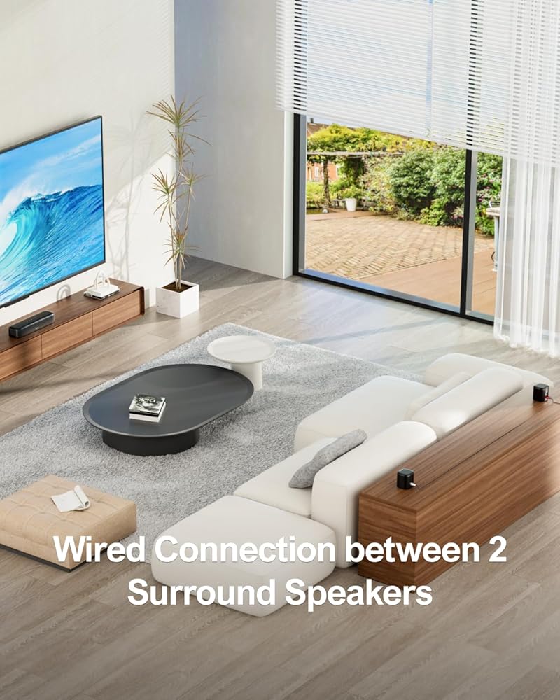 5.1ch Virtual Surround Sound System for TV: This 5.1 sound bar for smart tv features 3 main channels for crystal-clear dialogue, along with 2 surround speakers that create a virtual surround sound field. Utilizing SurroundX technology, it provides highly detailed audio with 99.99% accuracy. AI enhances sound quality for a realistic audio by coordinating speakers to simulate authentic sound movement. Note: Recommended for space of 108 to 215 ft².