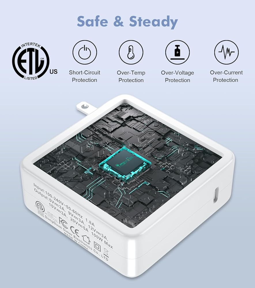 [Wattage Specifications] Input:100-240V~50-60Hz 1.8A Output:5V==3A, 9V==3A, 10V==5A, 12V==5A, 15V==5A, 18==5A, 20V==5A 100W Max. Work with mac laptop charger 96W 87W 67W 61W 30W iPad Pro 2021/2020/2019/2018.Includent: a macbook charger block and a USB C cable