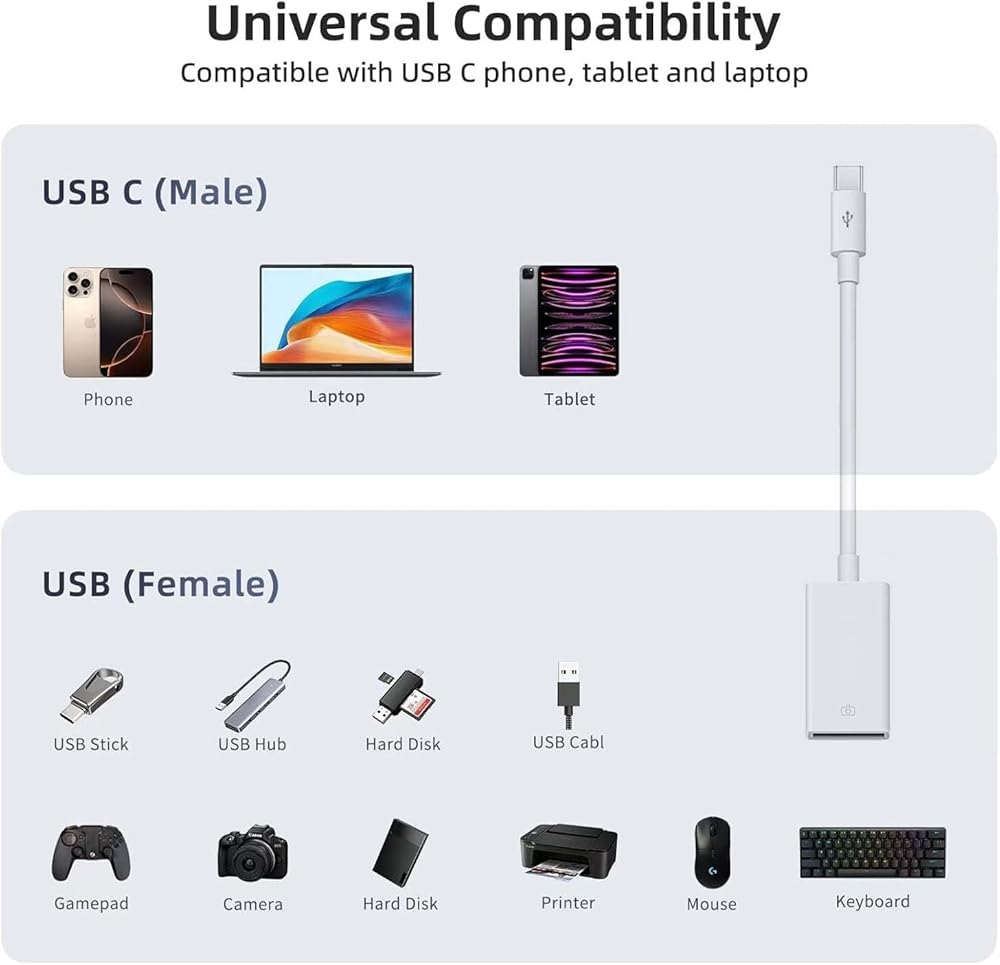 [Wide Compatibility] This adaptador usb a tipo c works with Type-C cable that is compatible with iPhone 16/15/14/13/12 Pro,Pro Max,Plus;for Apple Watch Series 9/8/7/6/Ultra 2/1; for iPad Pro 11,12.9, for iPad Air,for iPad Mini;Galaxy S23/S23 Ultra;Pixel 7;Type-C headphones,laptops,flash drive,card reader,webcam,keyboards,mouse etc.