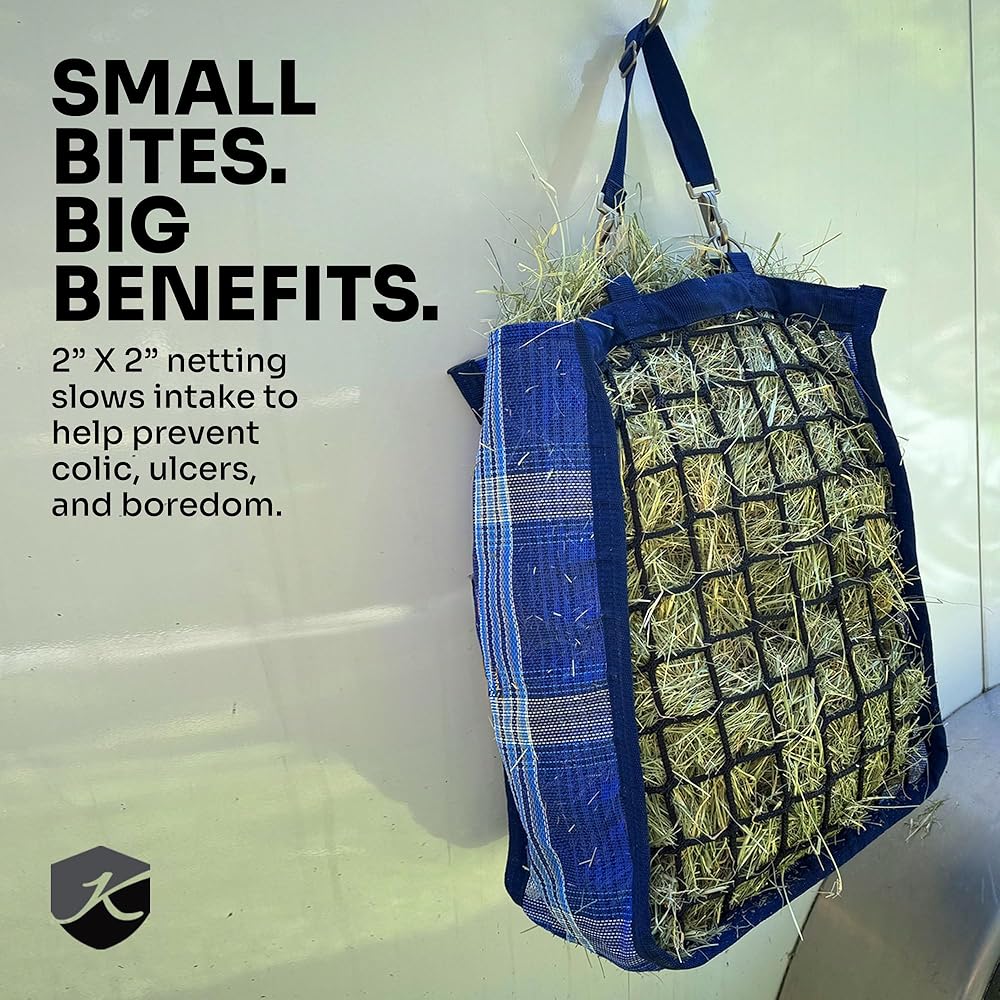 4 FLAKE SLOW FEED HAY BAG Regulates feed intake for a natural, healthy grazing effect which may improve digestion, reduce risk of colic and minimize stable vices. The poly netting is comprised of 1 1/2â squares to slow consumption and the durable Textilene® sides and bottom prevent waste. The adjustable strap lets you use the bag anywhere and it closes the top to minimize top feeding. Item code: KSFB4