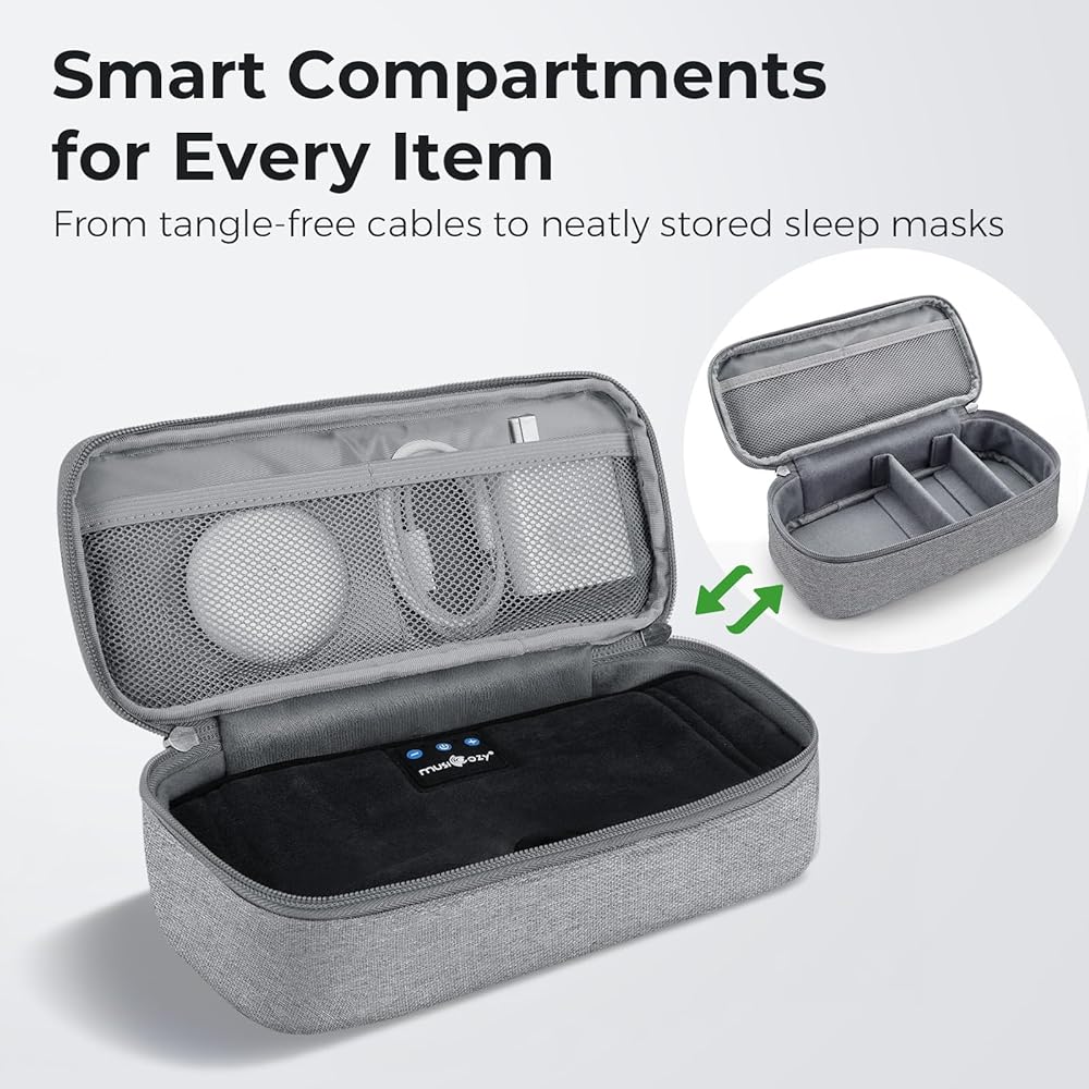 MUSICOZY Travel Storage Case for Bluetooth Sleep Mask & Electronics, Polyester Organizer Bag with Partition Pockets, Adjustable Dividers, Shock-Resistant Design for Cables, Chargers & Accessories