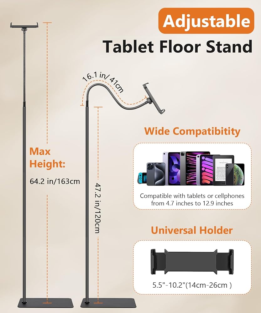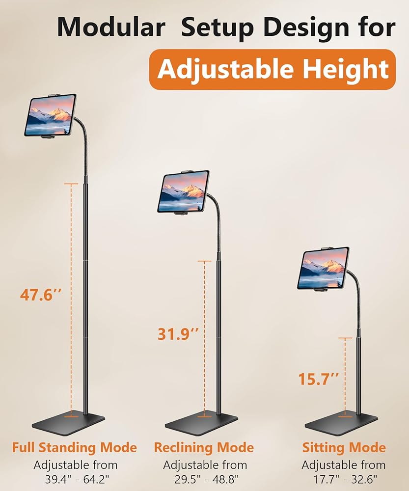 HEIGHT ADJUSTABLE: This flexible holder stand provide height adjustments from 17.7" to 64.2" off the ground, makes this iPad floor stand easy to suit all of your viewing postures, such as lying down, standing, sitting and so on.