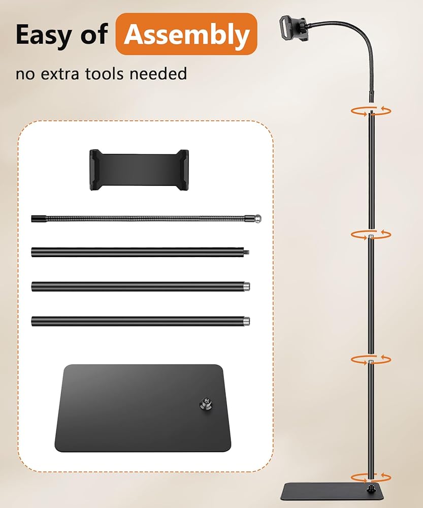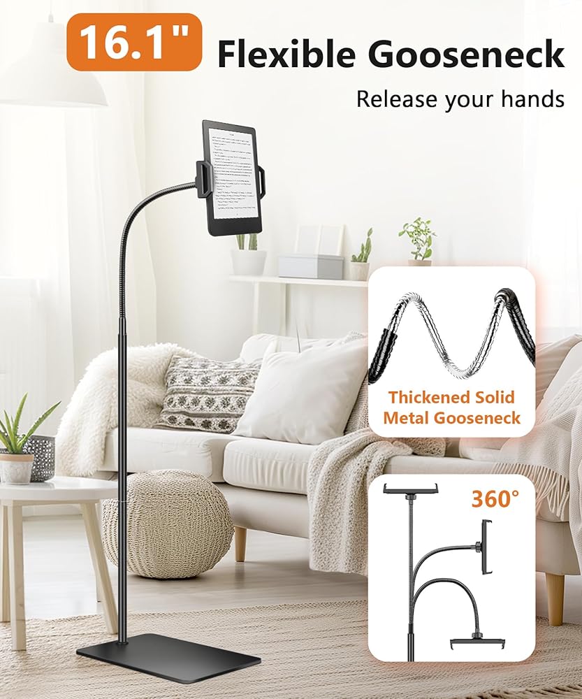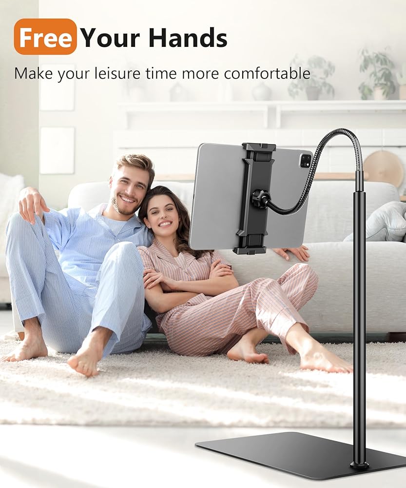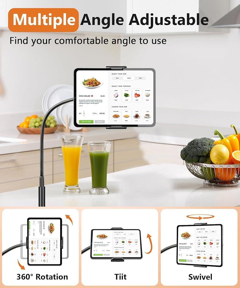 MULTI-ANGLE ROTATABLE iPAD STAND: This tablet floor stand with a 16.1 inch flexible gooseneck arm that can be bent in any directions. The universal ball on the holder mount with 360°swivel head can meet the needs of multi-angle adjustments.