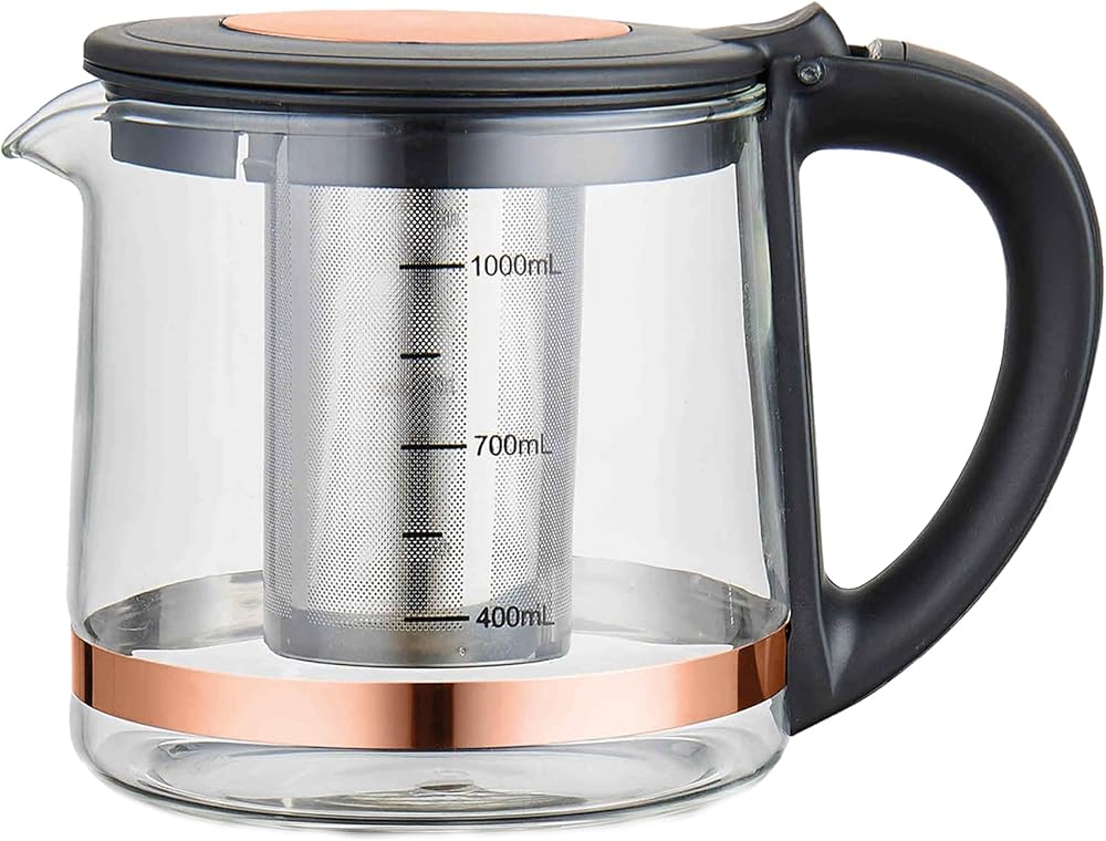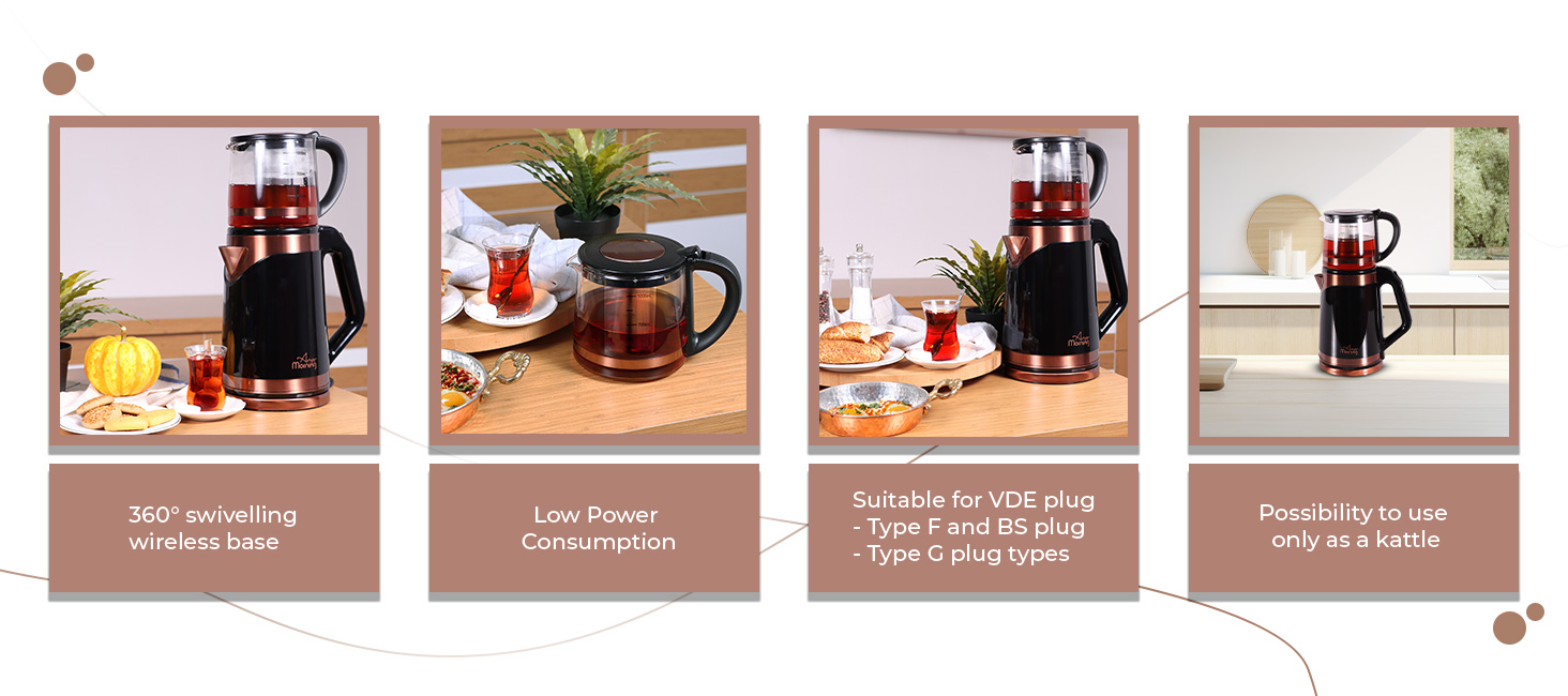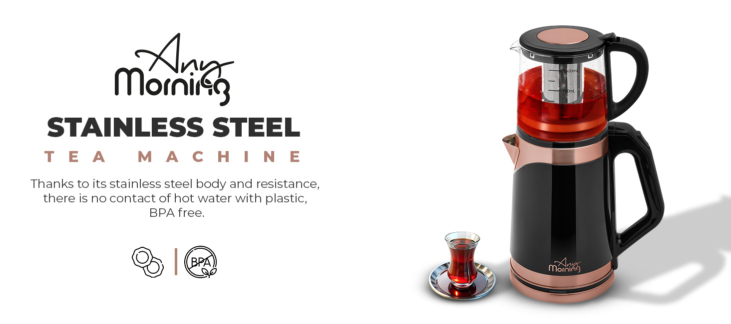 ماكينة صنع الشاي الكهربائية التركية من Any Morning مع خاصية الإغلاق التلقائي وحماية الغليان الجاف، غلاية لاسلكية مع مجموعة إبريق الشاي وفلتر قابل للفصل، قاعدة دوارة 360 درجة، 2 لتر، 68 أونصة، 1500 وات، أسود ونحاس، DE23203SX