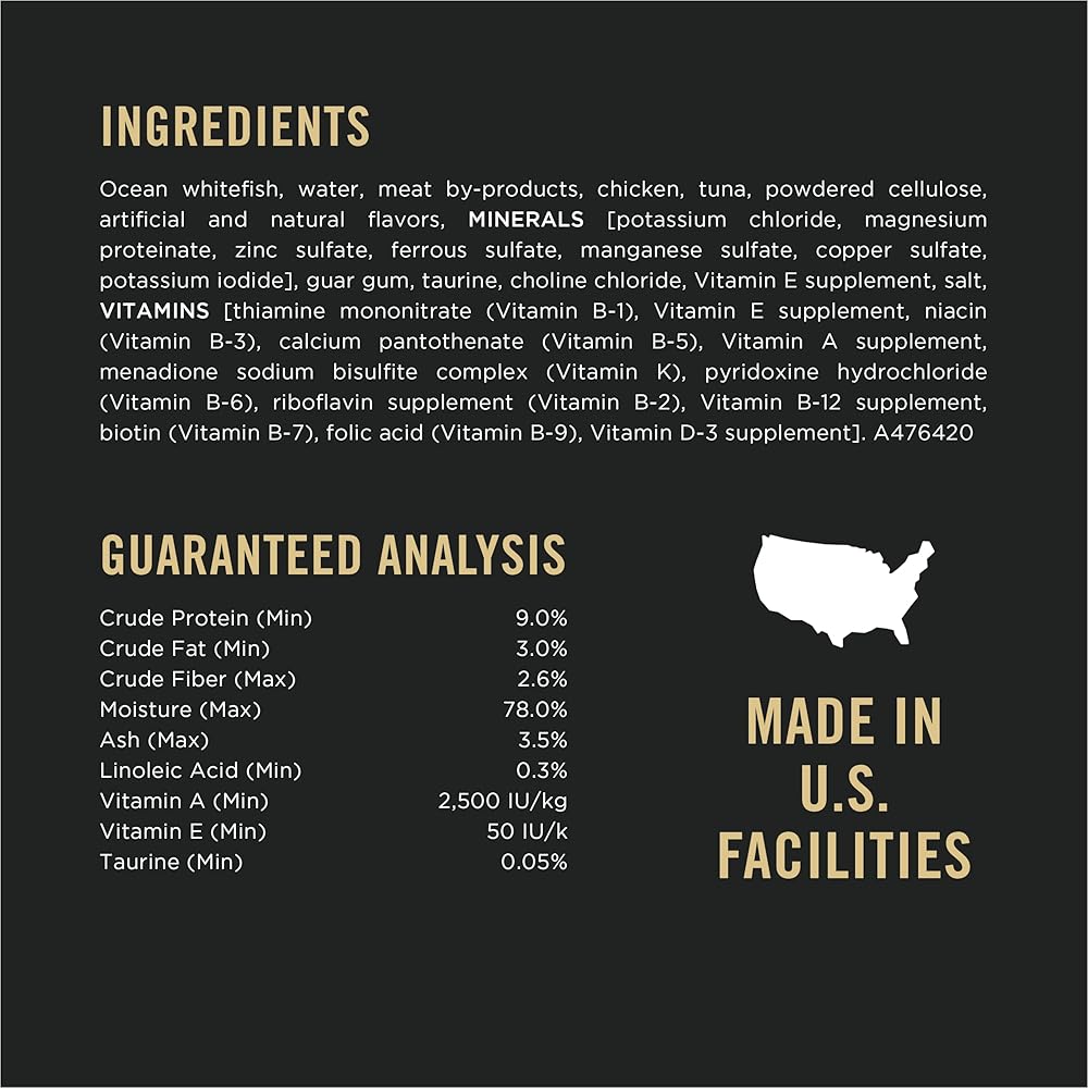 Use the power of advanced nutrition with Purina Pro Plan SPECIALIZED Hairball Ocean Whitefish and Tuna Entree Pate adult wet cat food. We craft our high protein wet cat food using real ocean whitefish and tuna for a taste cats love and add natural fiber for hairball control. Taurine, an amino acid, and vitamin A in our wet cat food support your cat's healthy vision. Each serving of this Purina cat food provides her with 25 essential vitamins and minerals along with antioxidants for a healthy immune system. Our pet nutritionists carefully select each purposeful ingredient in this cat wet food and don't include artificial colors or preservatives in this premium wet cat food entree. Every can of Purina Pro Plan SPECIALIZED Ocean Whitefish and Tuna cat food provides your adult cat with the 100 percent complete and balanced focused nutrition she needs and the seafood flavor that makes her come running to her meals.