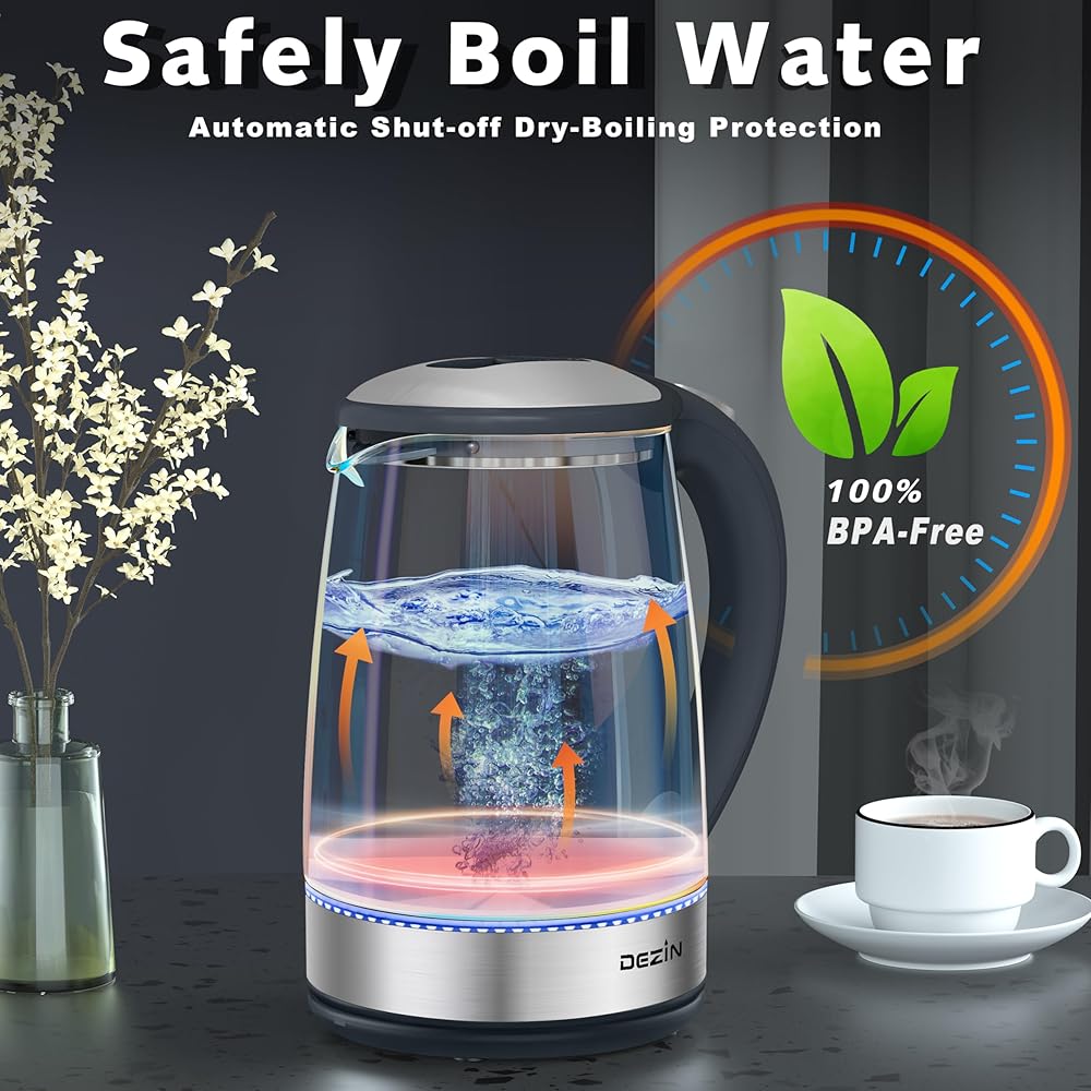 Dezin Electric Kettle, 2L Glass Tea Kettle & Hot Water Boiler, 304 Stainless Steel Hot Water Kettle with Auto Shut-Off Function,Fast Boil, Boil Dry Protection Tech for Coffee, Tea