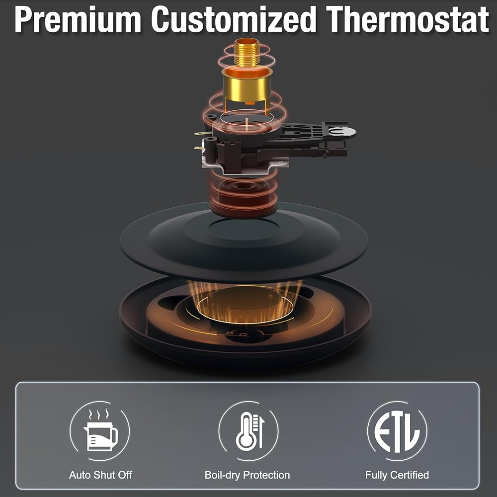• Humanized Design – Features an integrated power cord storage on the detachable base, this kettle can be cleaned easily at your convenience and keeps your kitchen tidy. The 360° swivel base offers a comfortable way for both right & left-handed people to take the kettle away from its base to fill or empty the water at any angle. Your hand also will be carefully protected from scalding by its non-slip and anti-scalding handle.