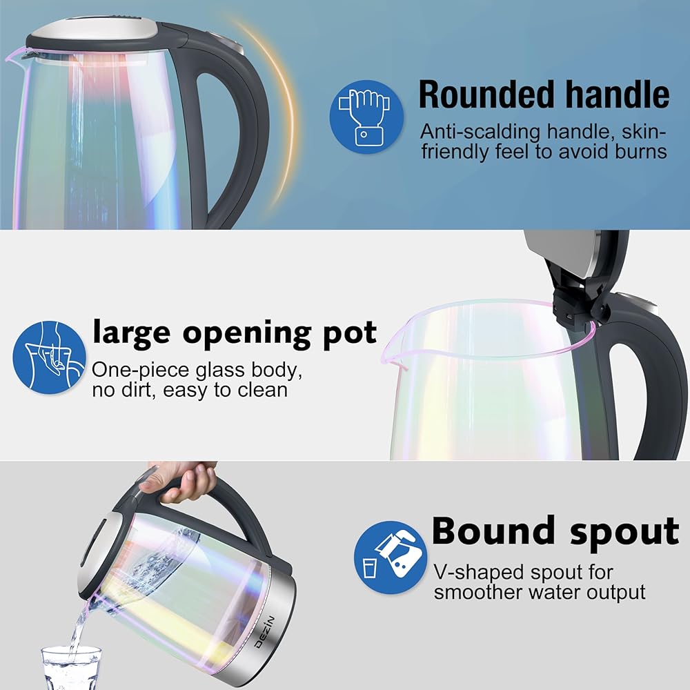 • Charming Addition – Dezin glass kettle utilizes a customize blue indicator technology to bring you a visible boiling process. This charming addition will brighten your kitchen when the kettle works and gives a sense of serenity that matches the property of water.