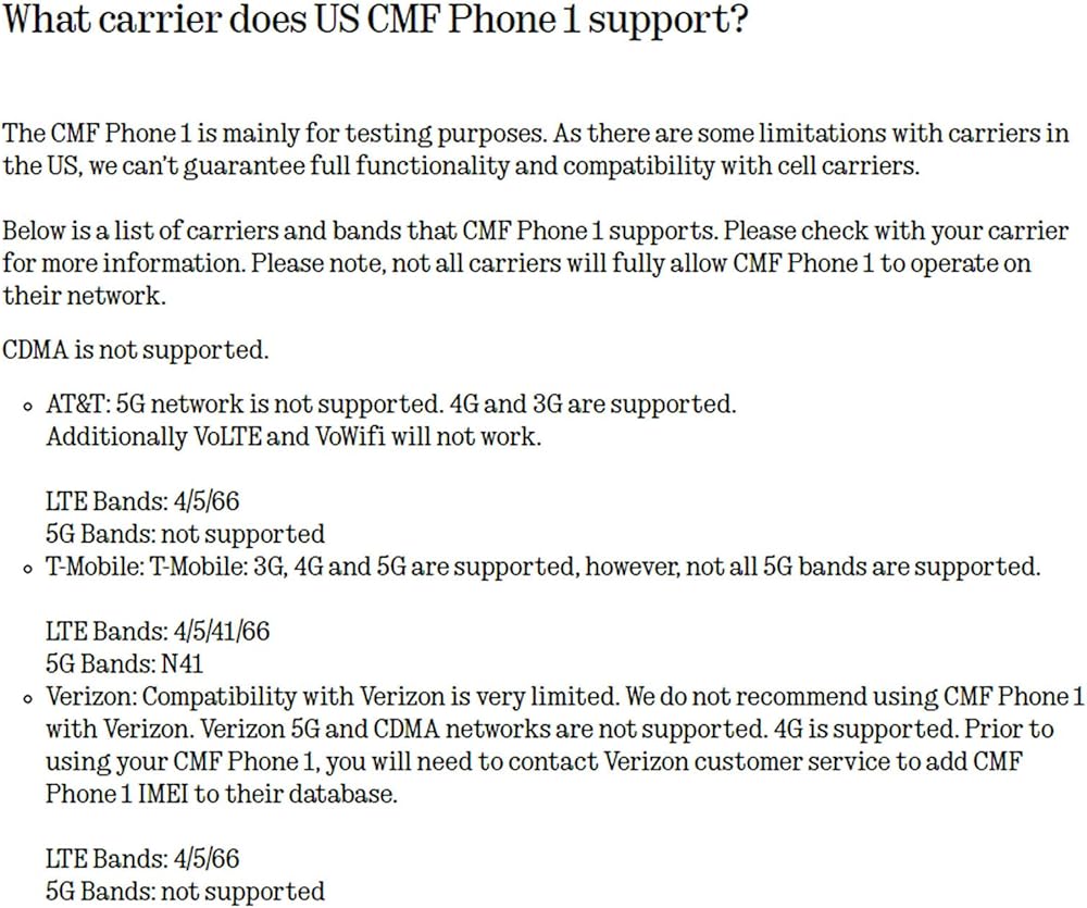 What carrier does US CMF Phone 1 support: CDMA is not supported. AT&T: 5G network is not supported. 4G and 3G are supported. Additionally VoLTE and VoWifi will not work. LTE Bands: 4/5/66. 5G Bands: not supported. T-Mobile: T-Mobile: 3G, 4G and 5G are supported, however, not all 5G bands are supported. LTE Bands: 4/5/41/66. 5G Bands: N41. Verizon: Compatibility with Verizon is very limited. We do not recommend using CMF Phone 1 with Verizon. Verizon 5G and CDMA networks are not supported. 4G is supported. Prior to using your CMF Phone 1, you will need to contact Verizon customer service to add CMF Phone 1 IMEI to their database. LTE Bands: 4/5/66. 5G Bands: not supported.