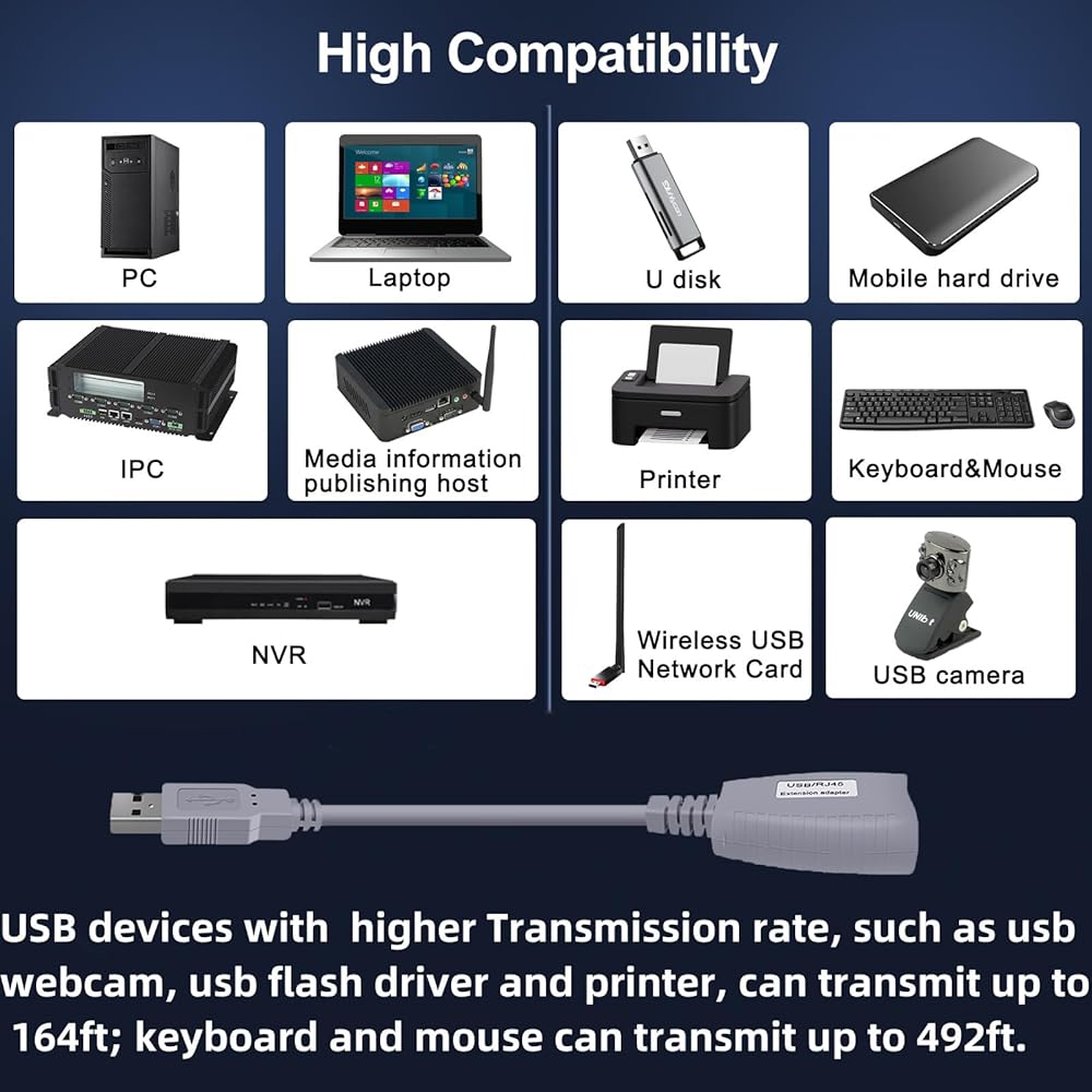Long distance transmission: USB over ethernet extends 1 USB2.0 signal up to 328 feet/100m over a single Cat5e/6/7 cable, compatible with both USB1.1 and USB2.0 peripherals