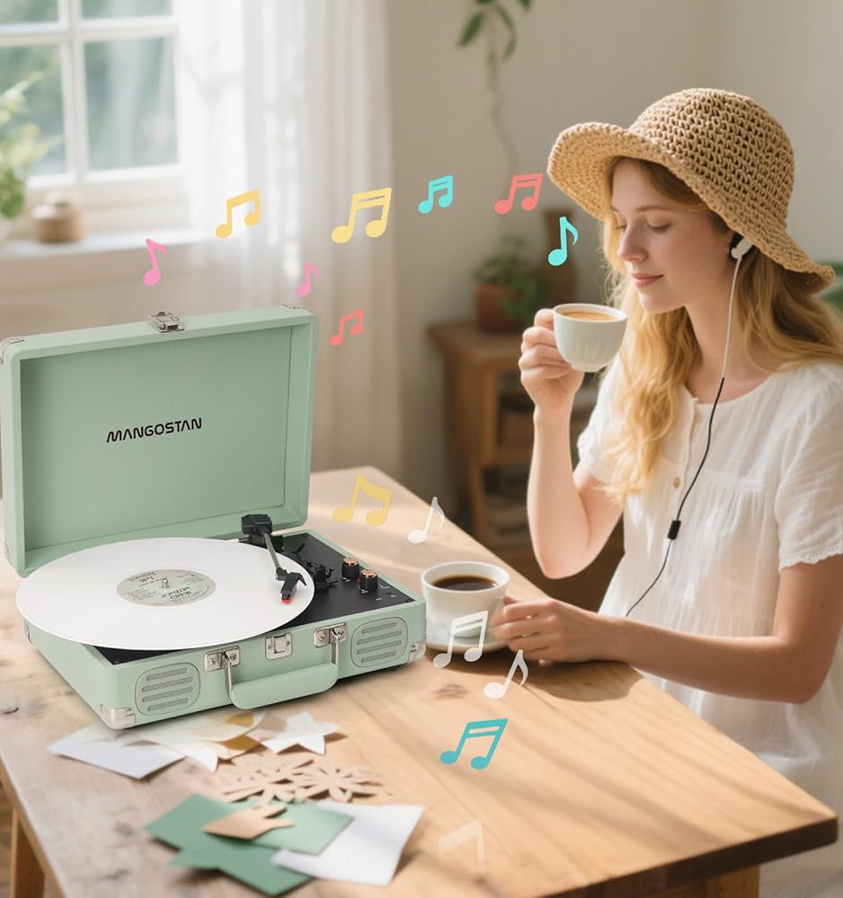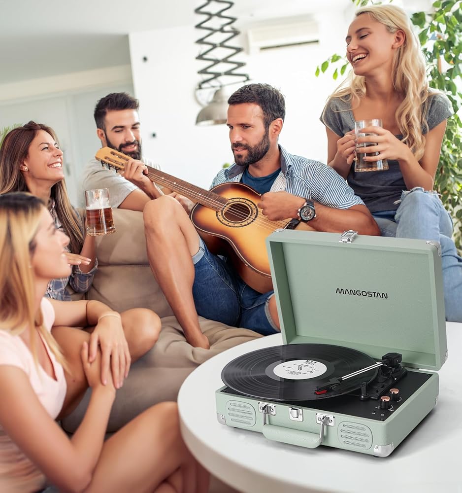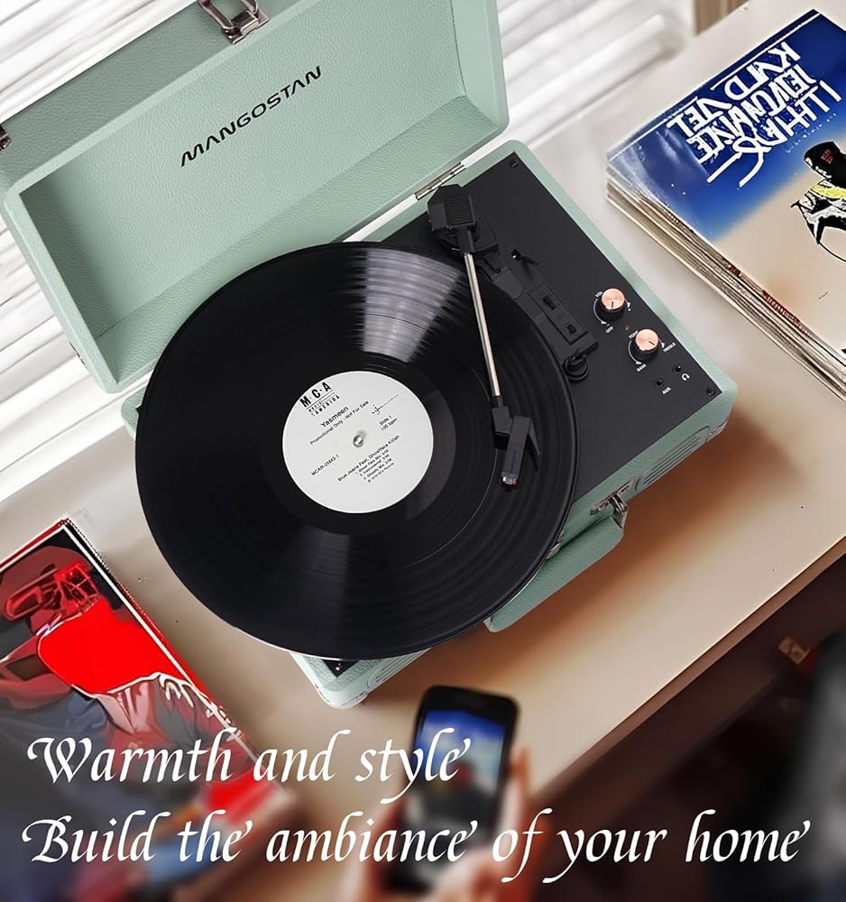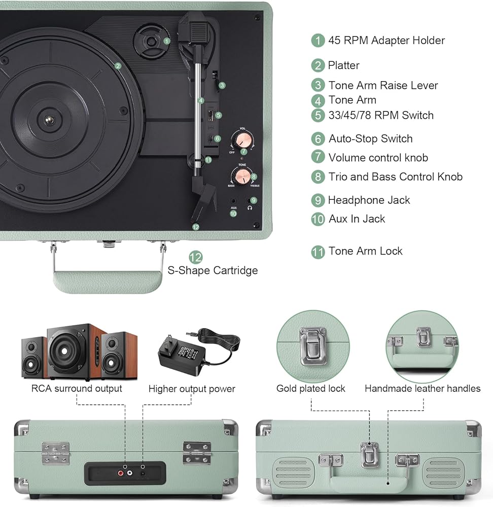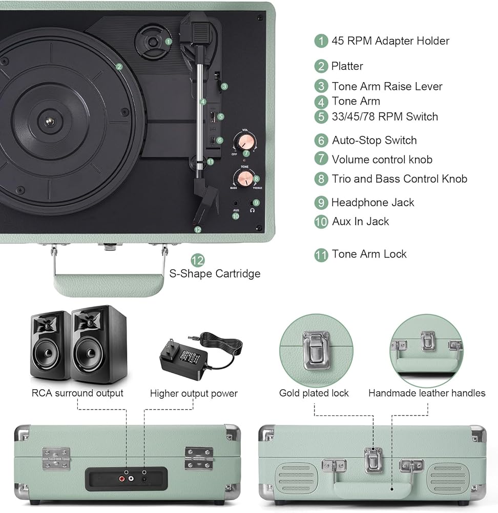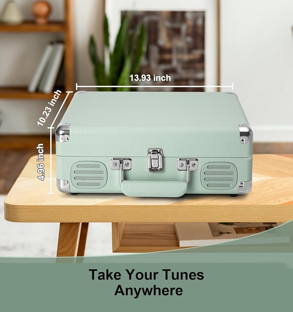 High Quality PU Leather Material: Green classic PU leather look with vintage metal Wraparound feet and hardware hinges. Combining retro and modern flexible design with a sturdy portable handle, you can listen to your music anytime, anywhere