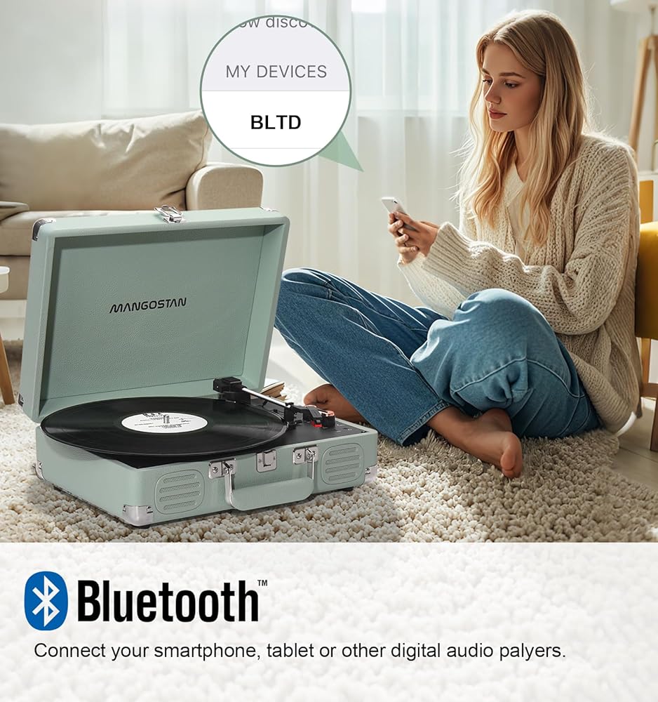 Bluetooth Record Player: Easily connect to smartphones, tablets, computers, and other devices without worrying about tangling cables.Bluetooth connectivity lets you easily play your albums through wireless speakers or stream your music to the vinyl record player's built-in speakers