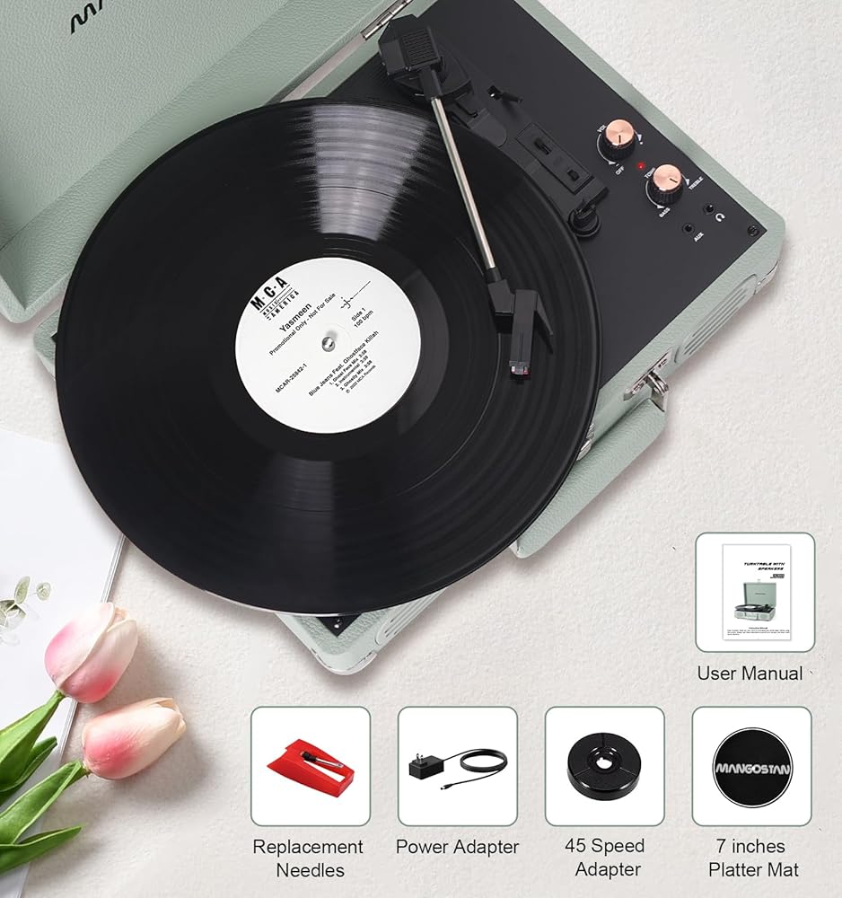 3 Speed Belt-Driven Turntable: This 3-speed (33 1/3, 45, 78 rpm) suitcase record player features upgraded premium sound quality and sits on sound isolating feet that prevent vibration. It also supports 3 sizes of vinyl records, 7/10/12 inches. which can meet your diverse size needs