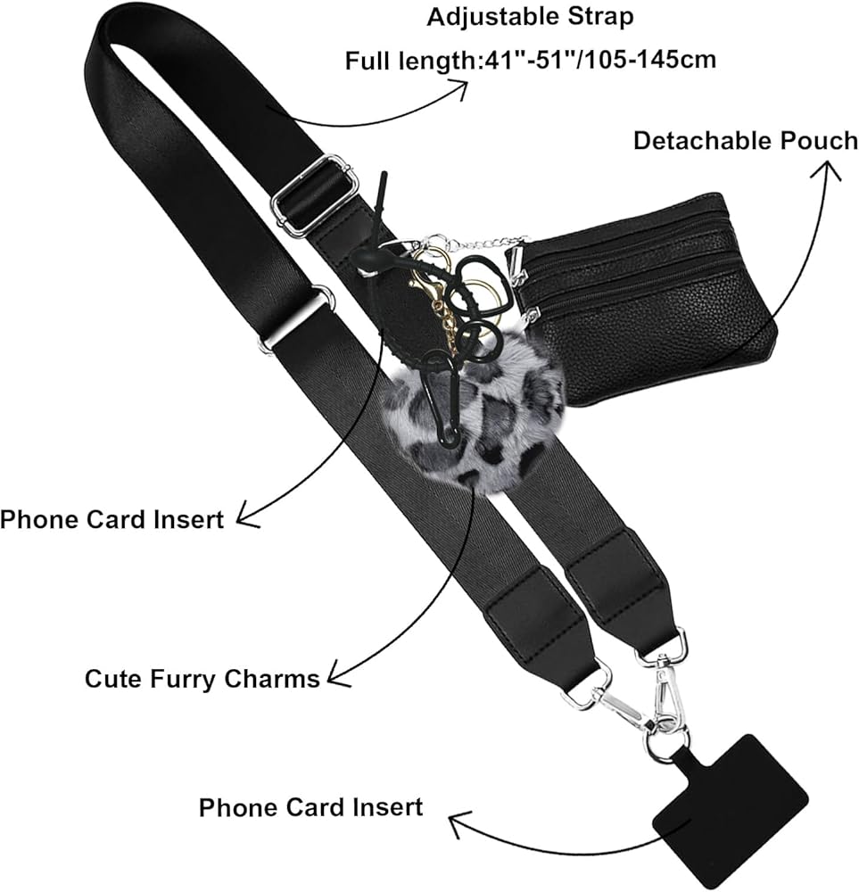 Clip and Go Phone Strap with Zipper Pouch Crossbody, Adjustable Chain Lanyard Leather Wallet with Cute Furry Charms and Lovely Key Chain Holder for All Phones, Black