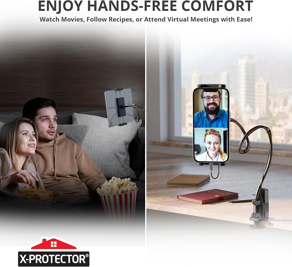 X-Protector Tablet Stand for 4.7" - 11" Devices - Holder for Bed with Cable Clips & Power Bank Holder - Mount Compatible with iPad Air/Pro/Mini, Amazon Kindle/Fire HD, iPhone
