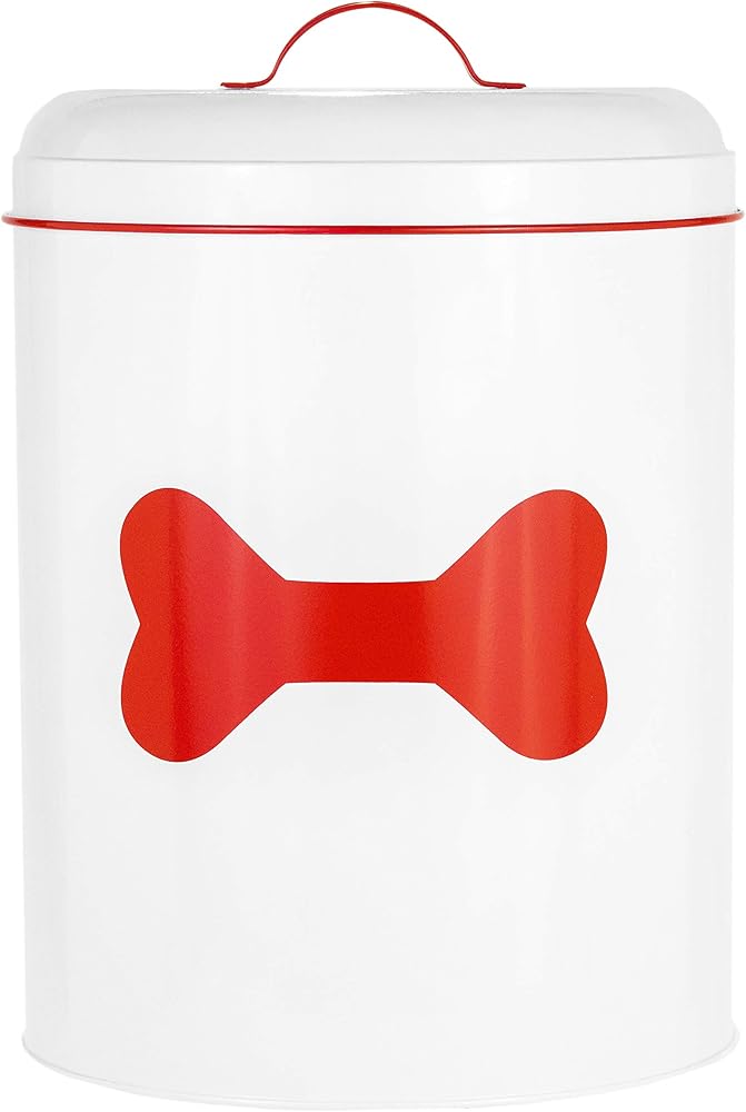 PET FOOD STORAGE - Safely stores your pup's food where no paw can reach, thanks to durable construction and a tight fitting ceramic lid with a gasket. FUNCTION AND FASHION - This metal food bin features a white coated finish with red accents. LARGE CAPACITY - Measuring 10.5" D x 14" H, this metal food bin won't take up too much space in your pantry. FOR A MAN'S BEST FRIEND - Perfectly matching any decor, this canister will put a smile on your face and have your pup's tail wagging. HANDWASH WITH CARE - This item should be hand washed to preserve their look and functionality.