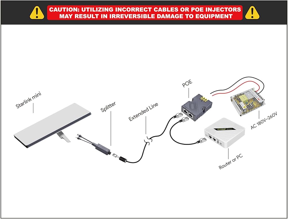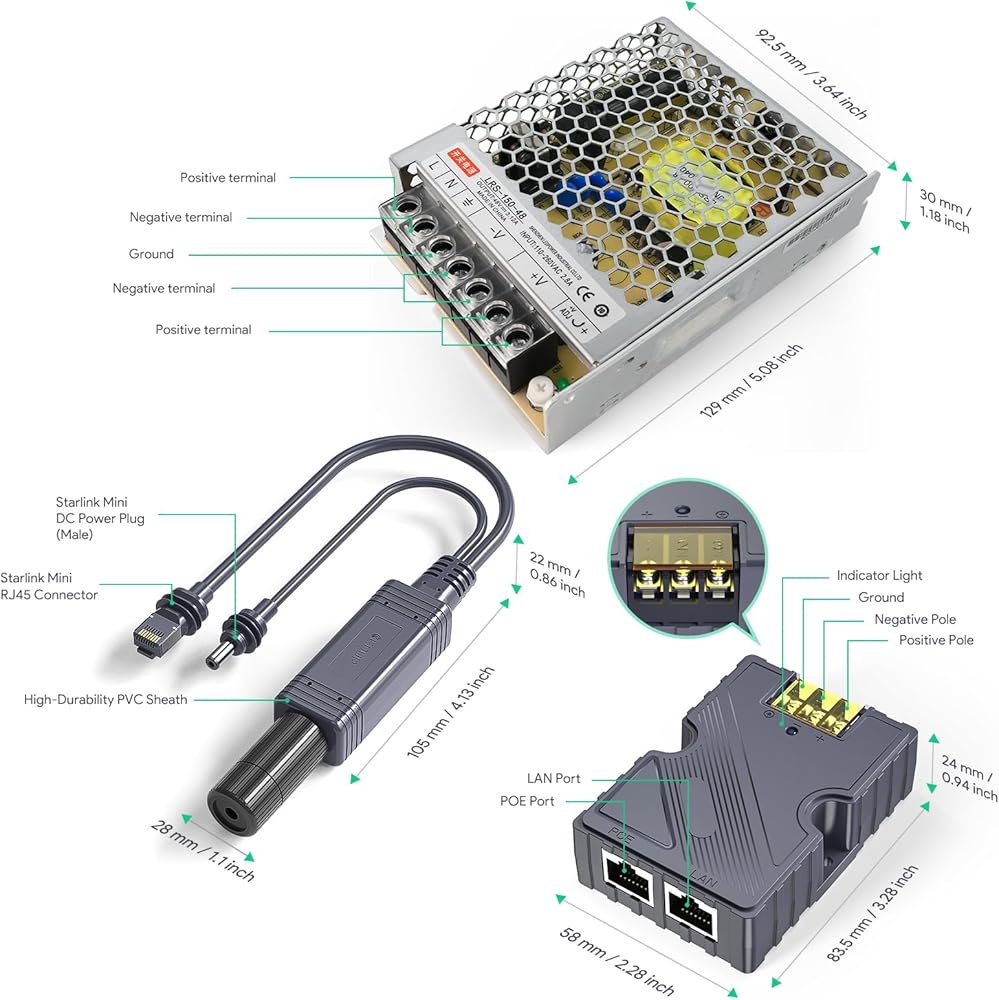 All-in-One Power Kit for Starlink Mini – This kit includes an AC 180-260V input power supply (48V 3A 150W), a Starlink Mini-compatible splitter, and a 150W Gigabit PoE injector, ensuring seamless compatibility and reliable performance for your Starlink Mini system.
