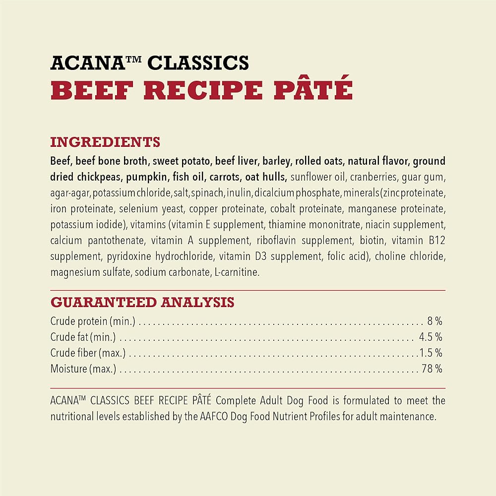 Help your dog feel so good inside, you'll see it on the outside! Nurture your dog with nourishing and wholesome ingredients in ACANA™ Classics Chicken Recipe Pâté dog food. Crafted with protein-rich chicken, this wet dog food is balanced with wholesome vegetables, barley and fruit, meaning it's packed with nutrients, not fillers. With a smooth, easy-to-eat texture, this nourishing ACANA wet dog food is perfect on its own or on top of your dog's favorite ACANA dry food. This ACANA dog food also helps provide them with the hydration they need. Nourish your dog with quality nutrition in ACANA Classics wet dog food pâté!