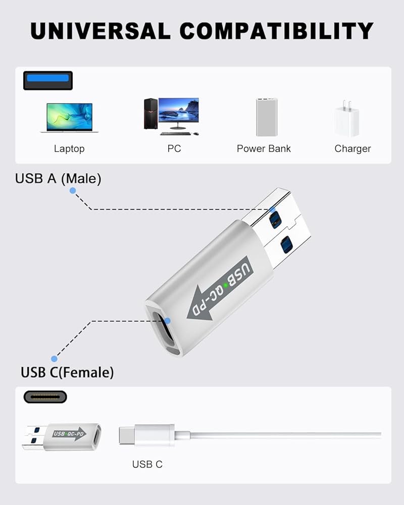 USB C Female to Male USB A Adapter turning USB ports into USB C ports to connect USB C devices to USB A ports build in. This enables you to connect Laptop, tablet, power banks, smartphone, etc.