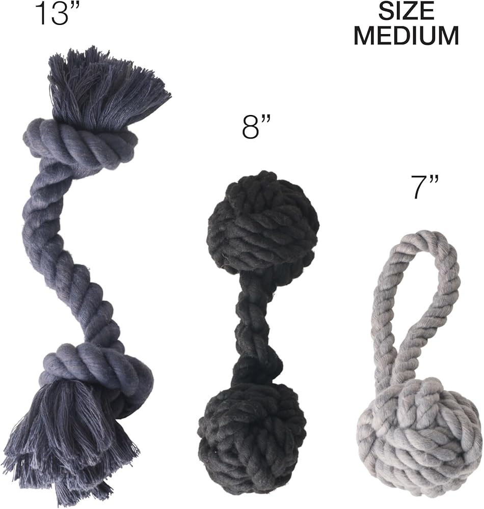 "Rope For The Best" 3-Pack Organic Cotton Dog Rope Pull Toys—the ultimate playtime companions for pets of all breeds! With these toys, it's play, tug, fetch, and repeat—keeping your furry friend entertained and happy for hours on end. Crafted from 100% organic cotton, they're not only pet-friendly but also earth-friendly, making them a guilt-free choice for environmentally conscious pet parents. Sturdy and washable, these toys are designed to withstand even the toughest play sessions. Their durable materials and tug toy design make them perfect for interactive play, promoting healthy exercise and bonding between you and your pet. Plus, they come highly recommended by our furry testers, earning 5-paws for fun! Whether it's a birthday, holiday, or just because, our 3-Pack Organic Cotton Dog Rope Pull Toys make the paw-fect gift for all your beloved fur babies!