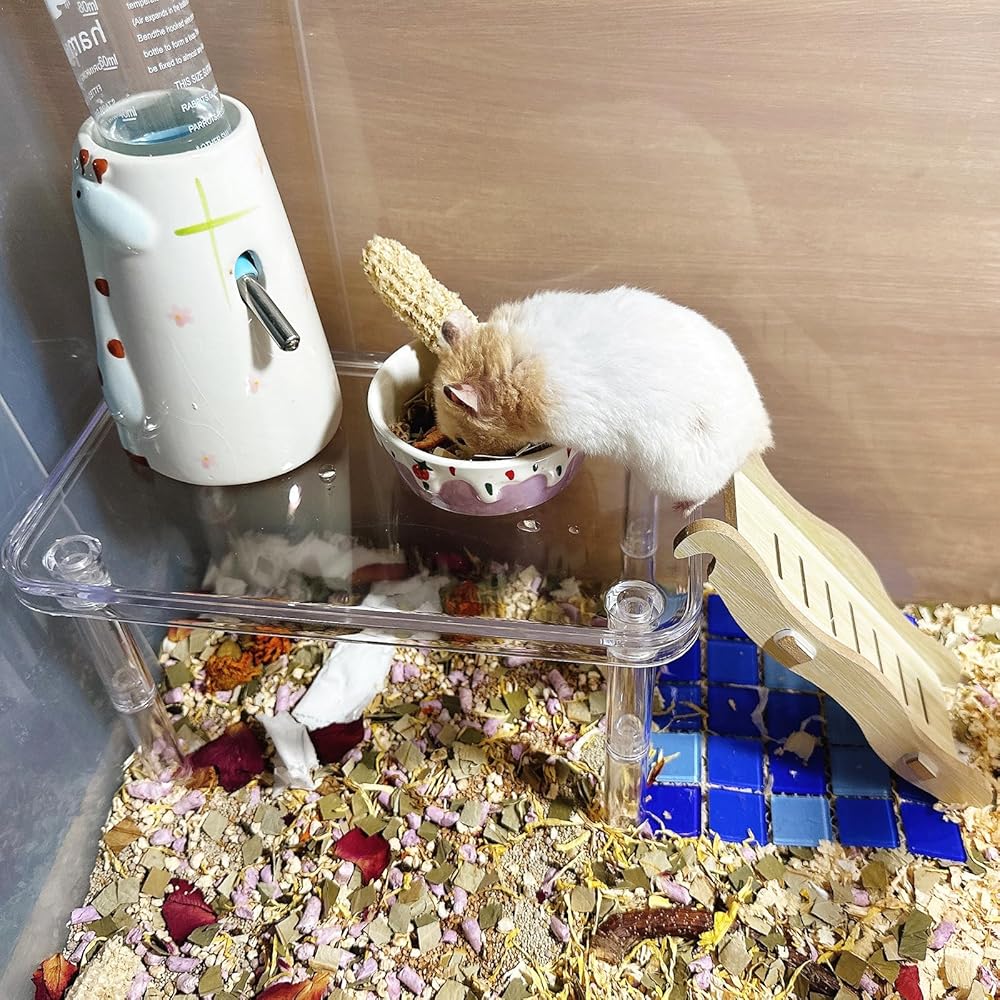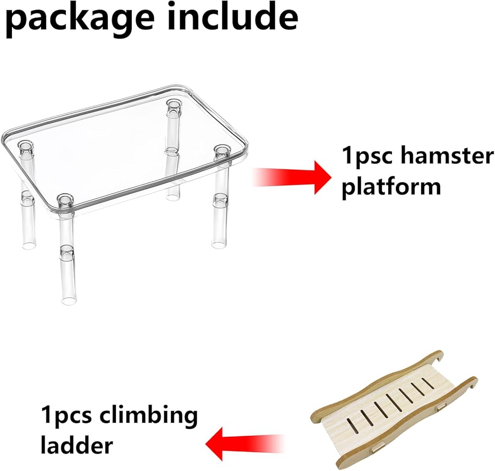 Package Include-1Pcs hamster platform & 1Pcs hamster climbing ladder .Made of high quality acrylic , without any glue,which is smooth and safe for your small pet animals to chew, climb, and play.