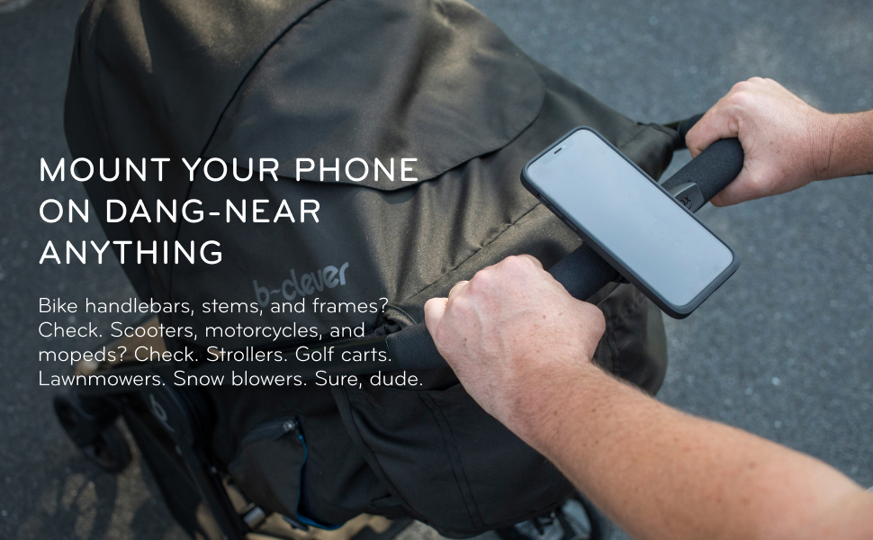 Mount on any handlebar or bar-like substrate: bikes, scooters, strollers, motorcycles, golf carts, and more