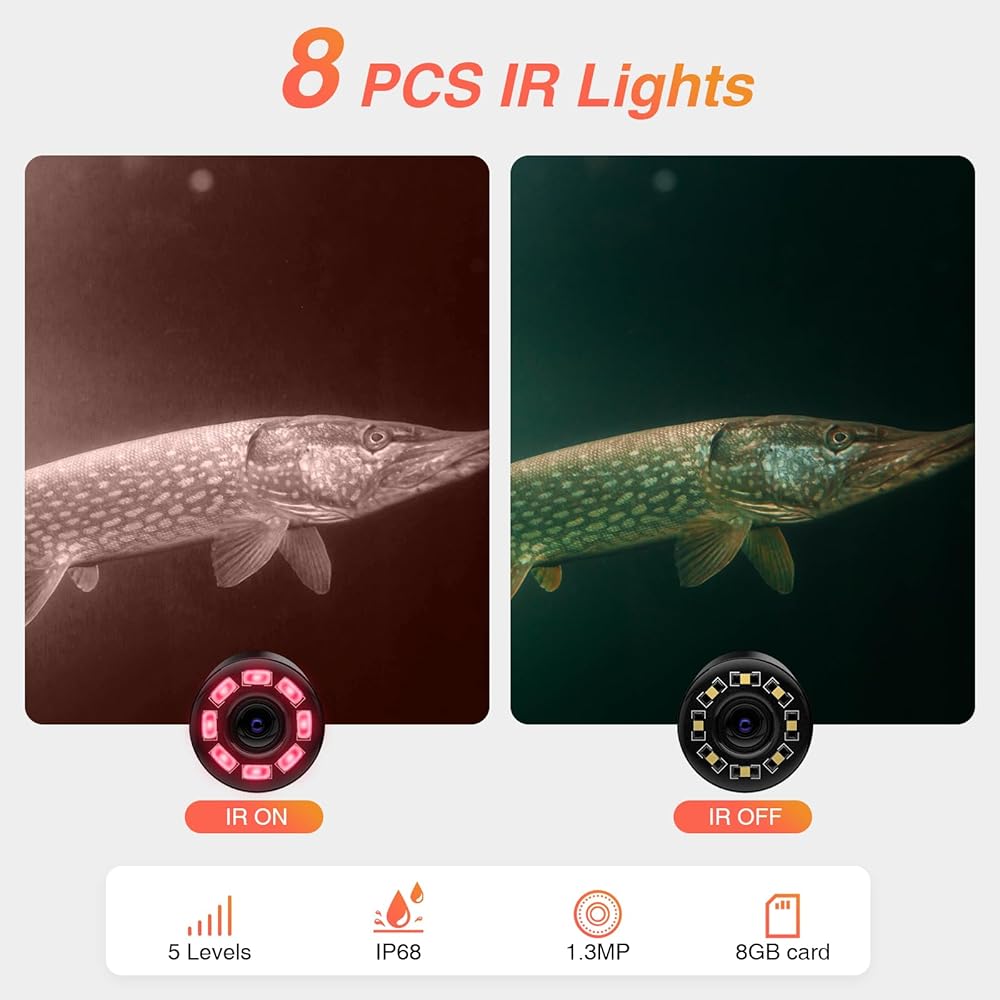 Incomparable Underwater Camera Lens:Delve into the depths like never before with our state-of-the-art underwater fishing camera. Boasting 8PCS powerful IR lights and featuring three adjustable levels of light brightness, this underwater camera for fishing ensures unmatched visibility even in challenging low-light or murky conditions. Explore the underwater world with confidence, whether you're on an ice fishing adventure or exploring hidden depths