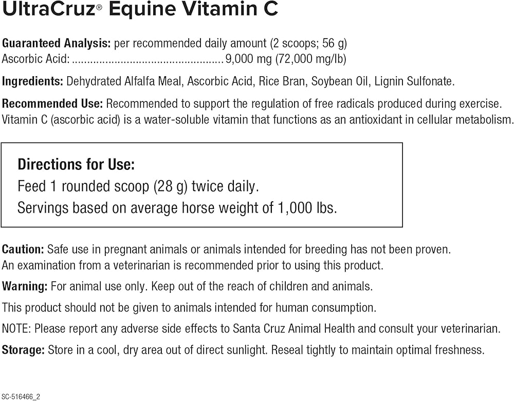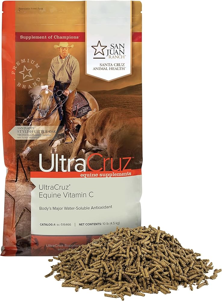UltraCruz Equine Vitamin C provides natural antioxidant and immune support for Horses. Vitamin C helps promote cartilage development and support healthy concentrations of other important elements, such as iron. It works closely with selenium and vitamin E to support the immune system and helps protect the body from the oxidative stress of Exercise, illness and certain medical conditions. This high quality vitamin C supplement is provided as a palatable Pellet or Pure powder.