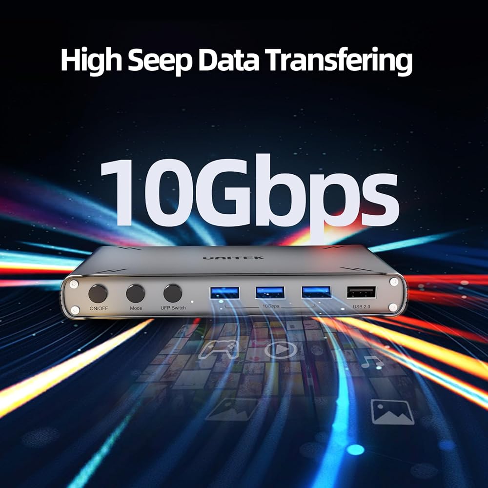 【5Gbps USB 3.0 ports】 Featuring four USB-A ports, the Unitek KVM switch seamlessly integrates with both USB 2.0 and USB 3.0 devices, including keyboards, mice, USB flash drives, printers, and mobile hard drives. With USB 3.0, you get lightning-fast data transfer speeds of up to 5Gbps, significantly faster than USB 2.0's 480Mbps, allowing for quicker file and image transfers to make your work and life more efficient.