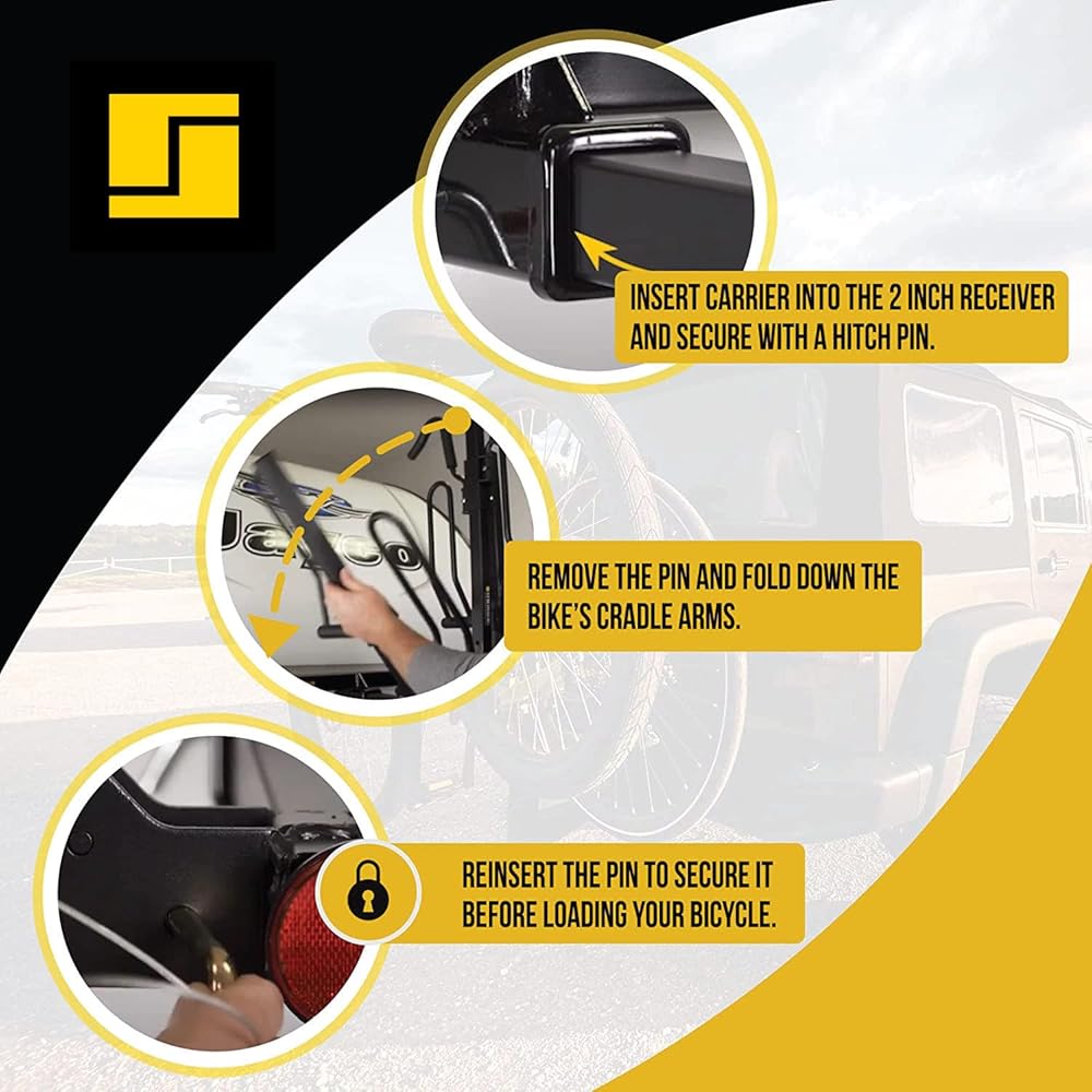 EASY TO INSTALL BIKE RACK HITCH: Stromberg Carlson's BC-202BA two-bike platform-mount bike carrier is a convenient way to transport your bikes wherever you go. Designed to fit 4" or 4.5" square bumpers on your RV or 2" hitch receivers on your vehicle, our easy-to-install platform-mount bike carrier makes it easy to transport your bikes without removing each bicycle.