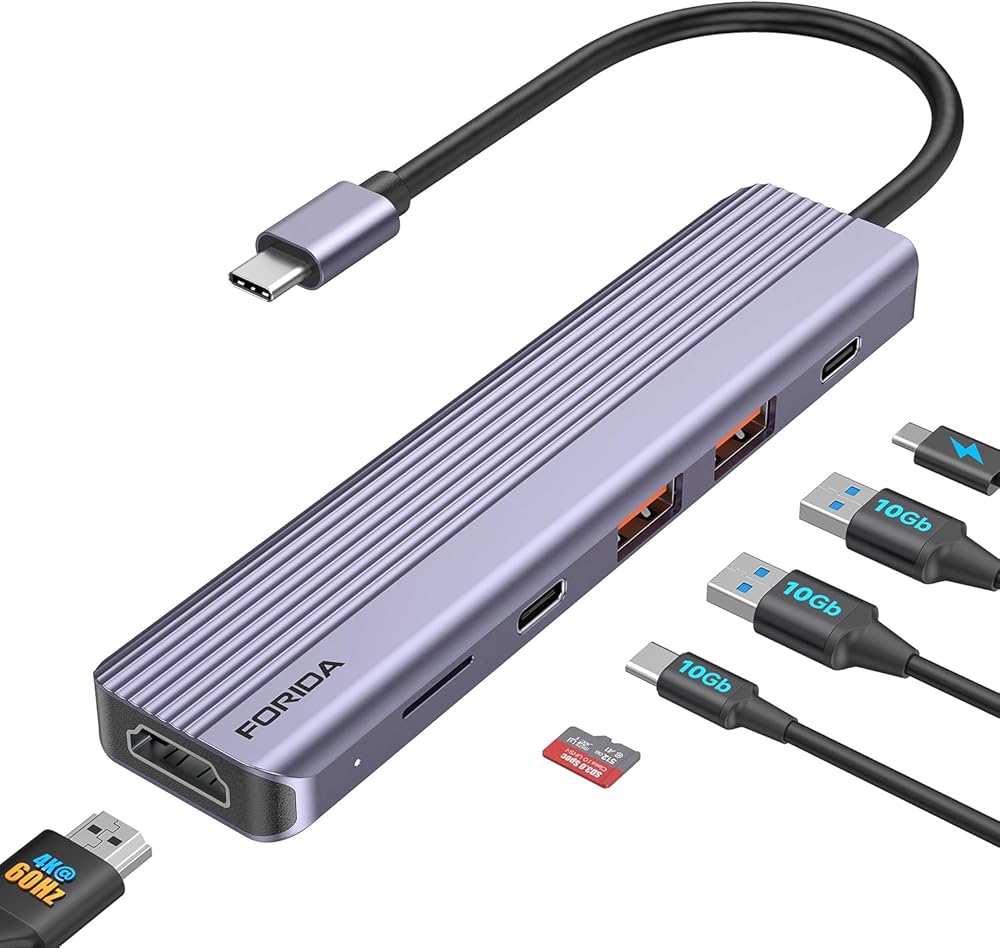 FORIDA 6 in 1 USB C Hub, 10Gbps USB 3.2 C to HDMI Adapter for MacBook, 4K@60Hz for Monitor, 3-Port USB-3.2 Ports,100W PD & Micro SD Crard Reader, Compatible with Surface, XPS, Samsung, Dell, etc